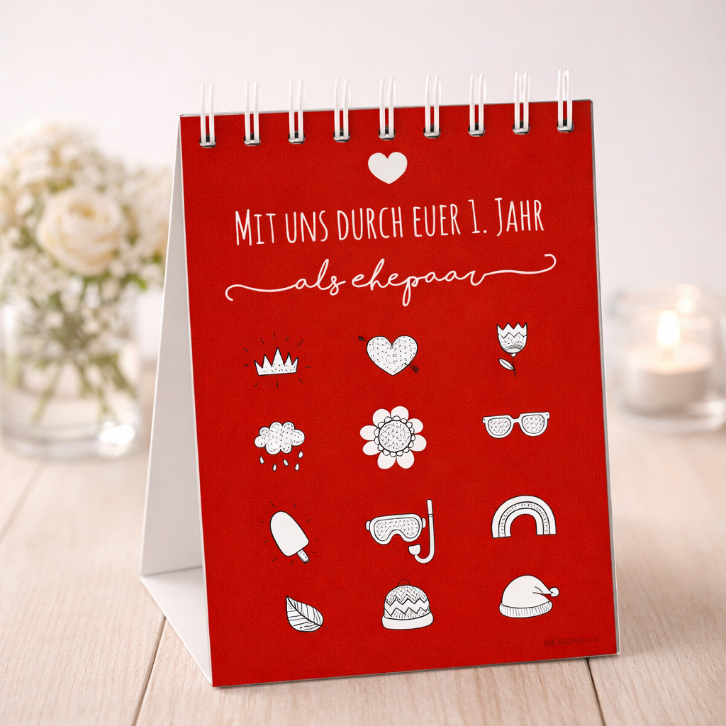 Der Kalender macht sich besonders schoen auf dem Schreibtisch, im Regal oder am Lieblingsplatz des Brautpaares.