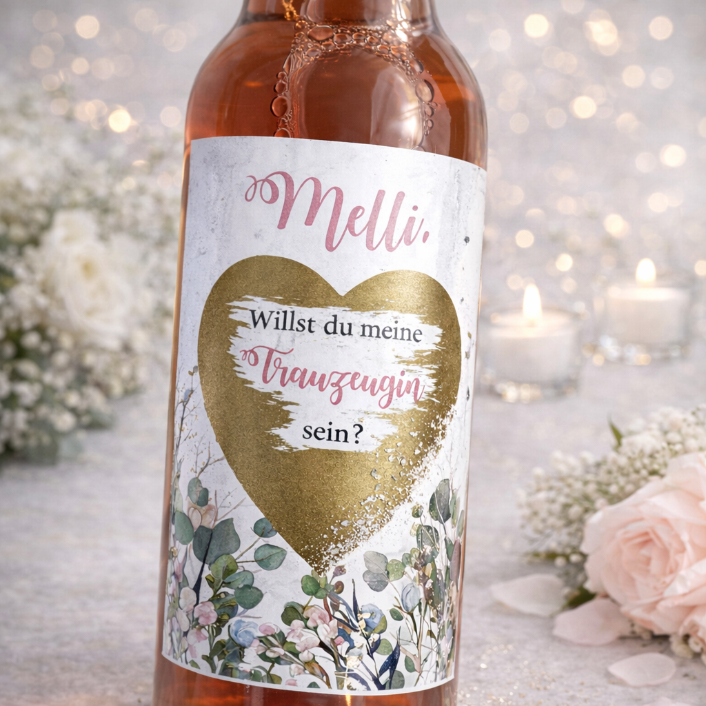 Das Weinetikett wird speziell für deine Trauzeugin angefertigt und mit ihrem Namen personalisiert. So entsteht ein ganz persönliches Geschenk mit liebevollem Überraschungseffekt.