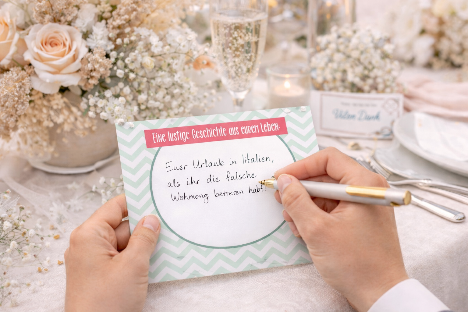 Am Tag der Feier könnt ihr die Karten an einer Leine in der Location aufhängen oder dekorativ auslegen. Über das Mikrofon bittet ihr die Gäste, sich jeweils eine Karte auszusuchen und zu gestalten.
