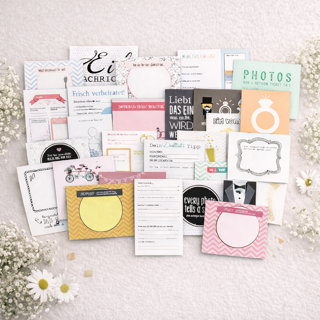 Optional könnt ihr bereits vorab ankreuzen, was der jeweilige Absender eintragen soll. Zusätzlich notiert ihr auf jeder Karte das Datum, an dem sie an das Brautpaar verschickt werden soll.