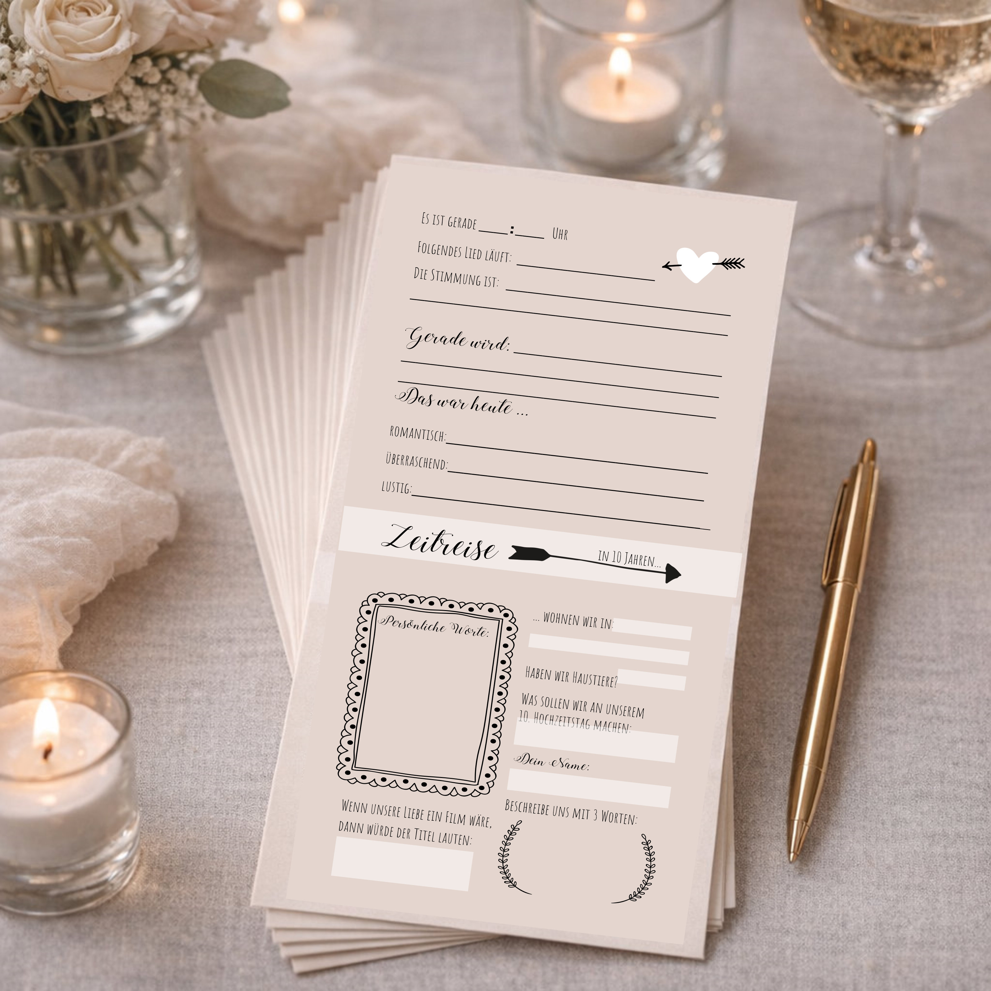 Ihr erhaltet 50 liebevoll gestaltete Zeitkapselkarten in Kraftpapieroptik. Die Karten werden am Tag der Hochzeit von den Gaesten ausgefuellt, anschliessend fest verschlossen und bis zum 10. Hochzeitstag vom Brautpaar aufbewahrt.