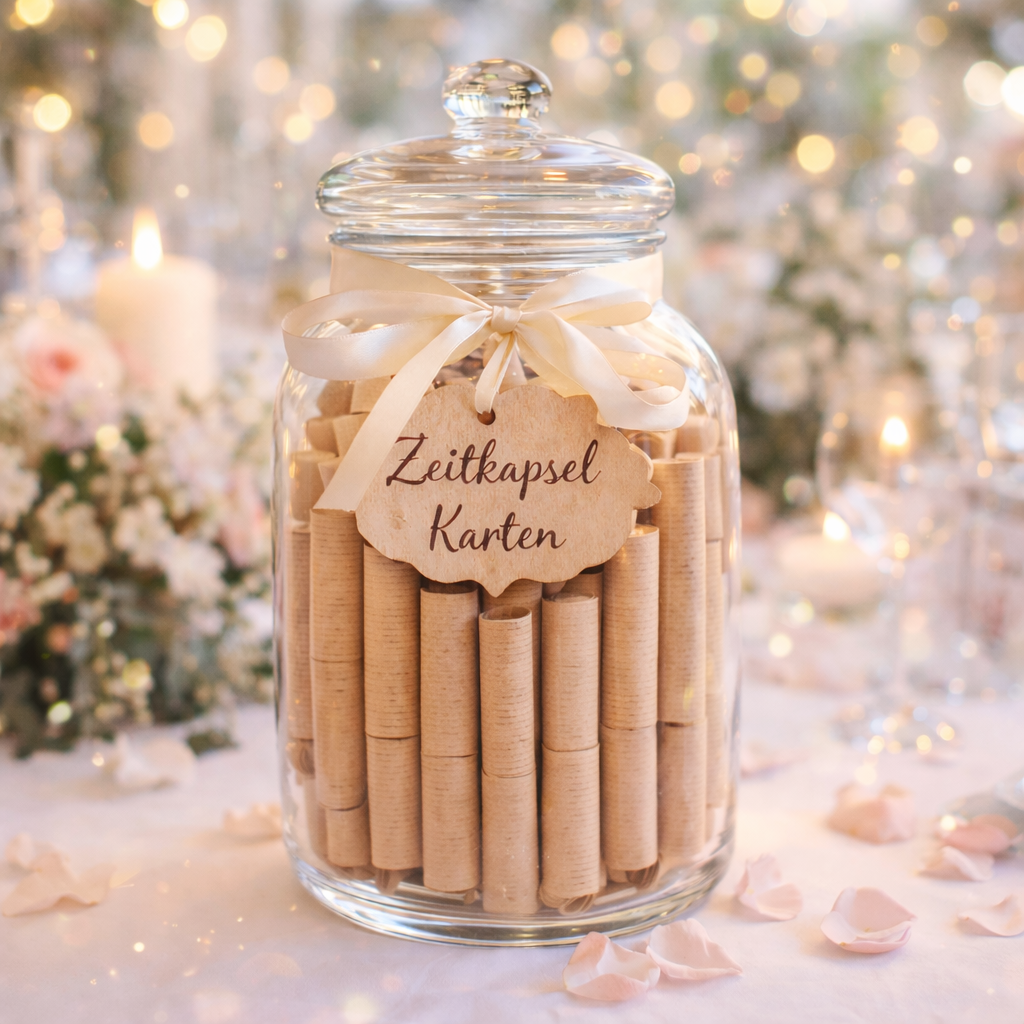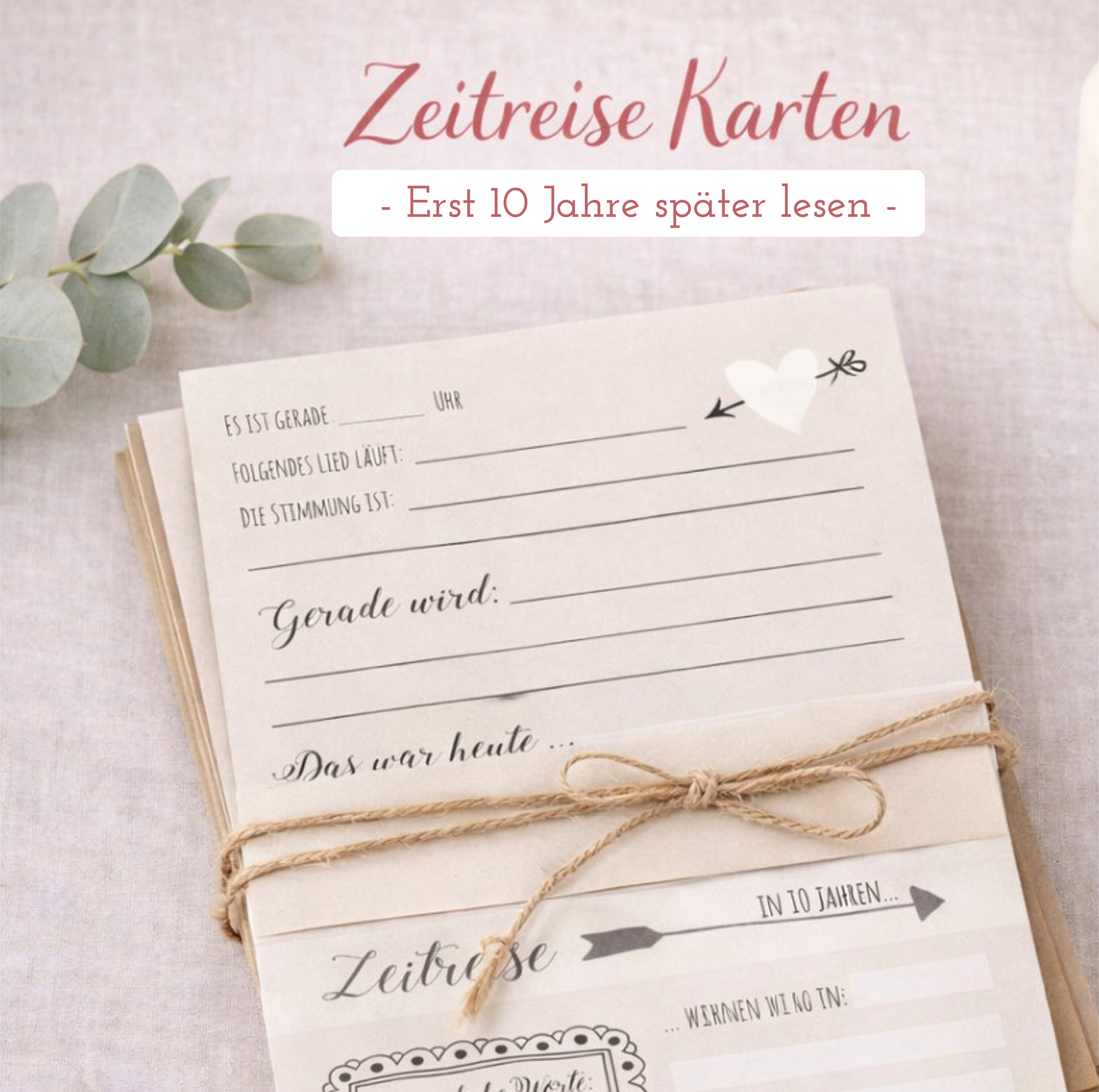 Mit den Zeitkapselkarten schreiben Familie und Freunde Briefe an das Brautpaar, die erst zum 10. Hochzeitstag geoeffnet werden. So entstehen ganz persoenliche Botschaften, Wuensche und Erinnerungen, die viele Jahre spaeter noch einmal beruehren.