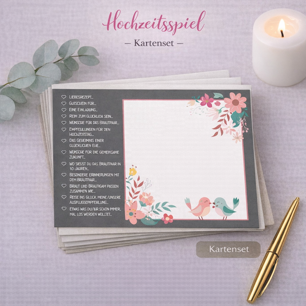 Die Hochzeitsgaeste versenden ihre Karten nach und nach mit persoenlichen Worten, Erinnerungen und kleinen Botschaften. So entsteht ein emotionales Hochzeitsspiel, das die Hochzeitsfreude weit ueber den grossen Tag hinaus verlaengert.