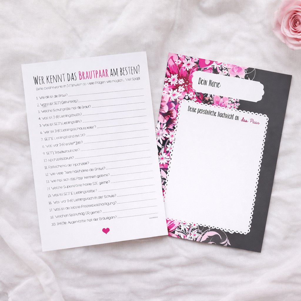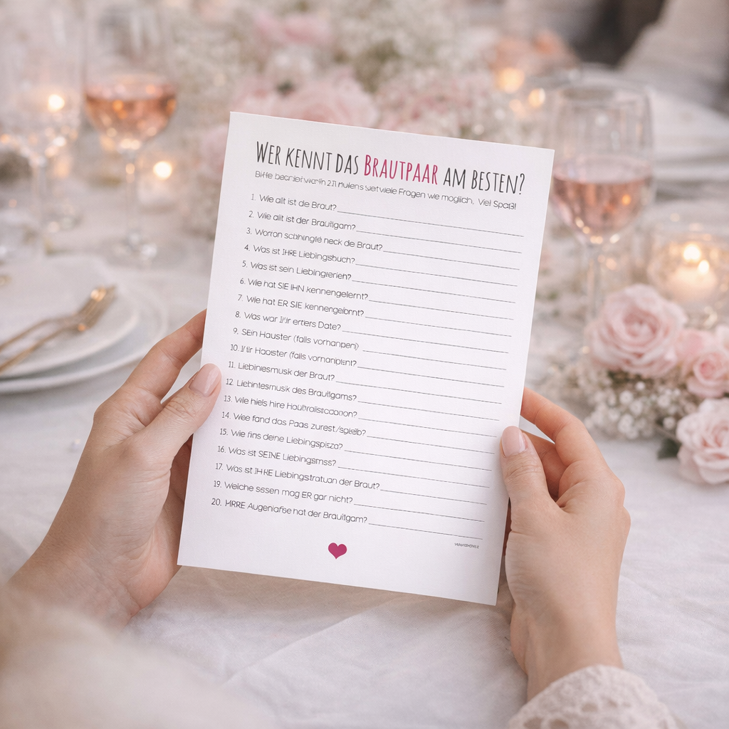 Ein klassisches und zugleich unterhaltsames Hochzeitsspiel, das fuer viele Lacher und schoene Erinnerungen sorgt. Mit diesem Quizspiel finden eure Gaeste heraus, wer das Brautpaar wirklich am besten kennt.
