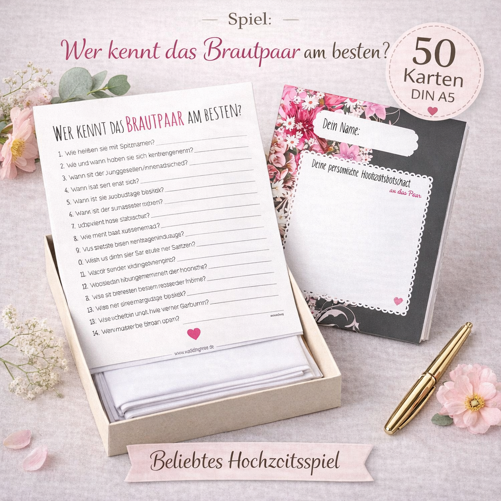 Ihr erhaltet 50 liebevoll gestaltete Karten, die am Tag der Hochzeit an die Gaeste verteilt werden. Diese beantworten die Fragen und quizzen munter drauf los.