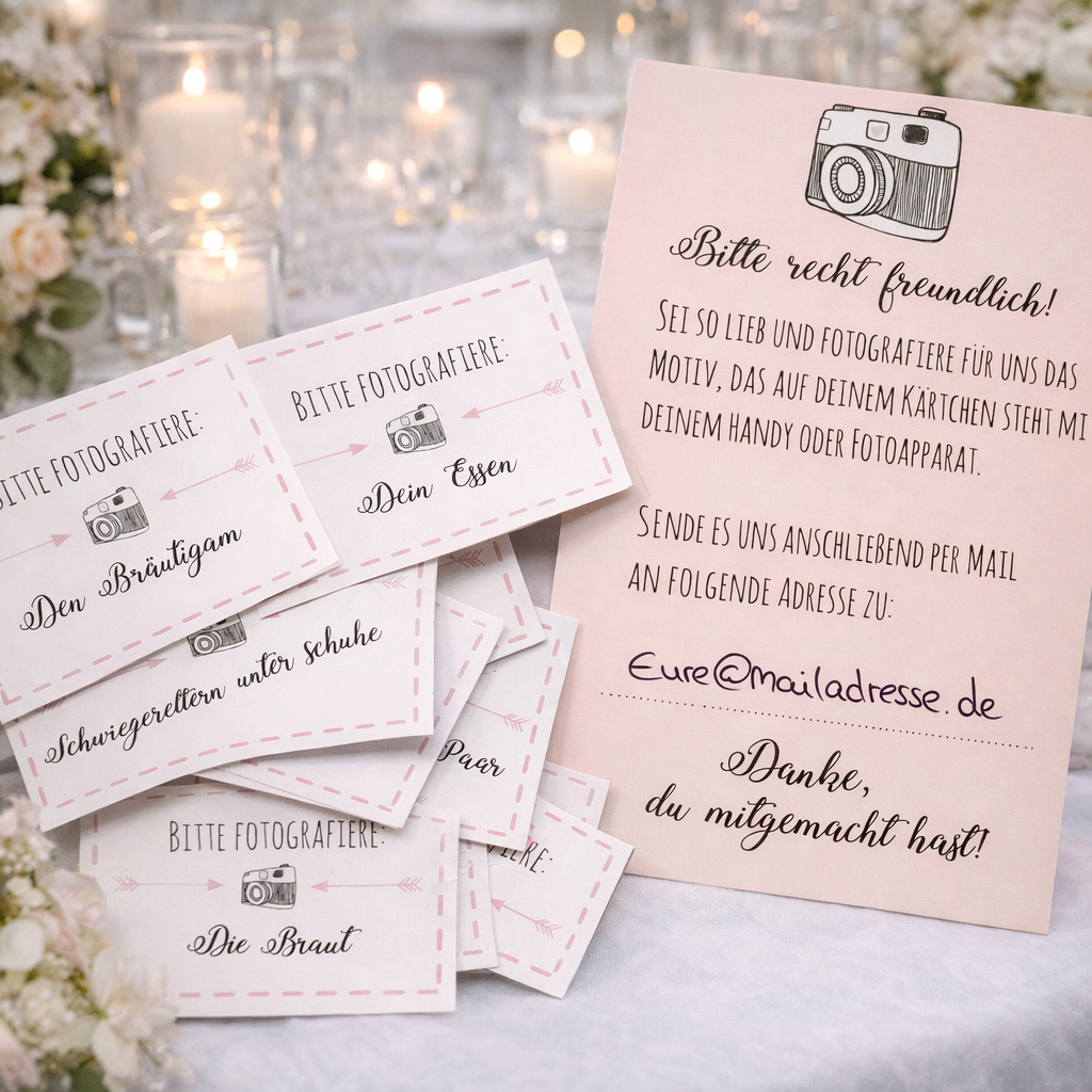 Dieses unterhaltsame Hochzeitsspiel animiert eure Gäste, wundervolle, lustige und emotionale Momente eures großen Tages festzuhalten. Mit kreativen Fotoaufträgen entstehen einzigartige Erinnerungen aus ganz unterschiedlichen Blickwinkeln.