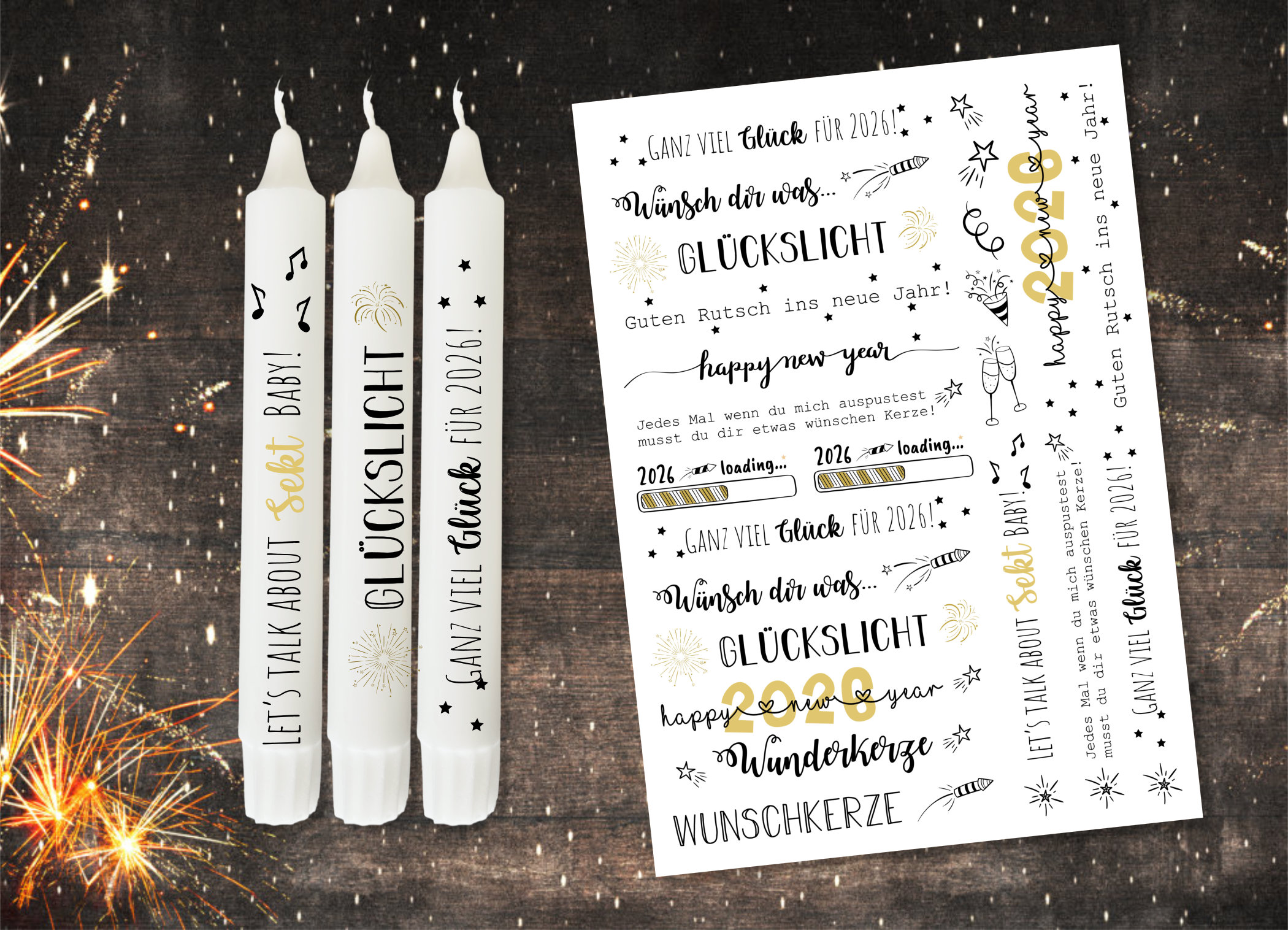 Kerzensticker HAPPY NEW YEAR auf Wasserschiebefolie Neujahr