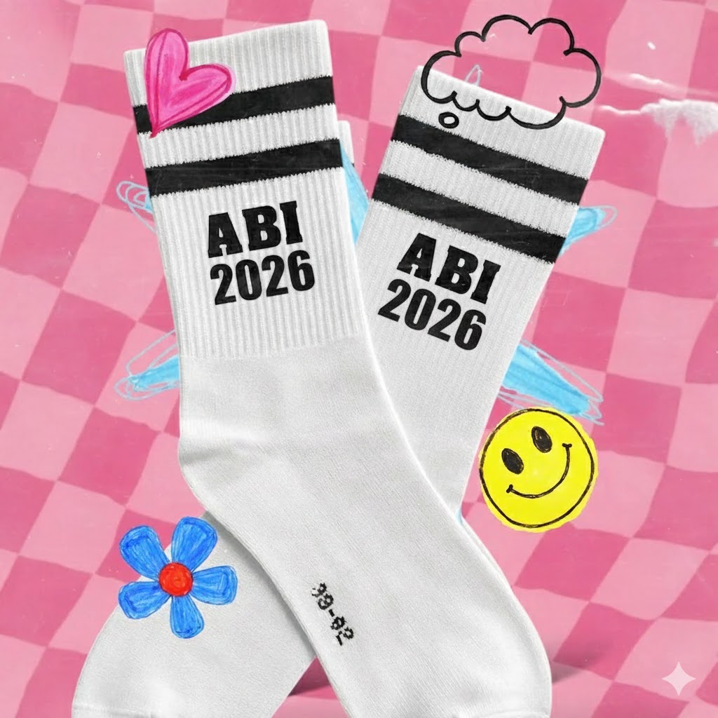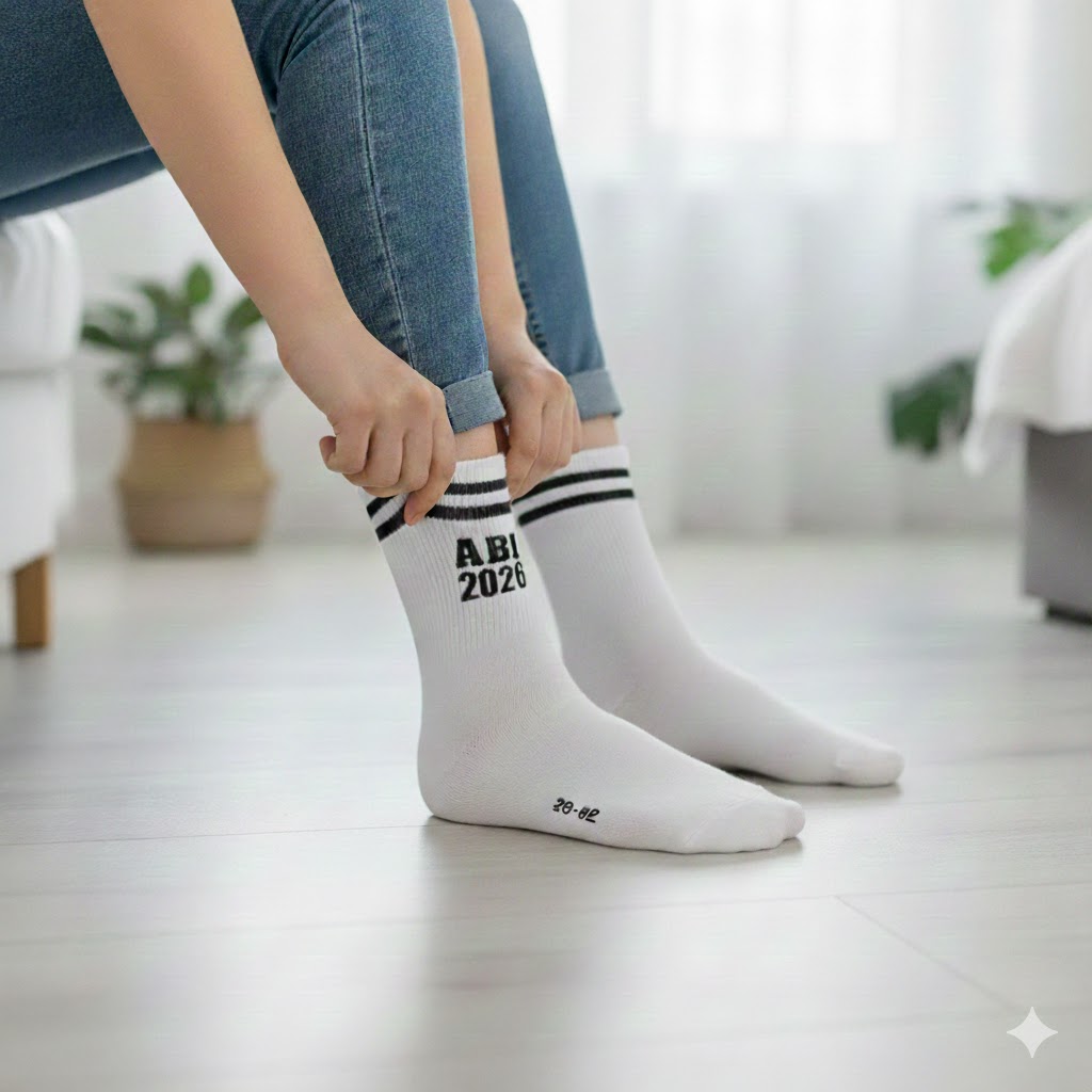 Hochwertige Tennissocken mit Abi-2026-Design · Weiches, angenehmes Tragegefühl · Geeignet für Schule, Freizeit und Sport · Ideale Geschenkidee zum Abitur und Schulabschluss
