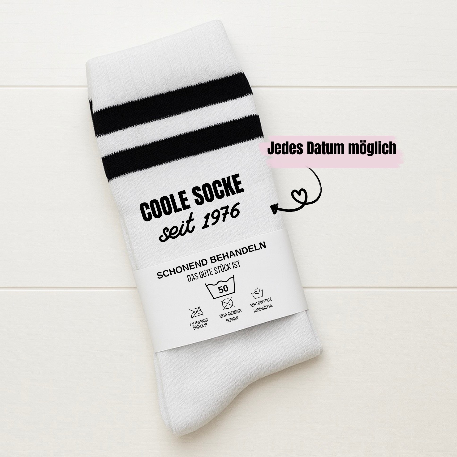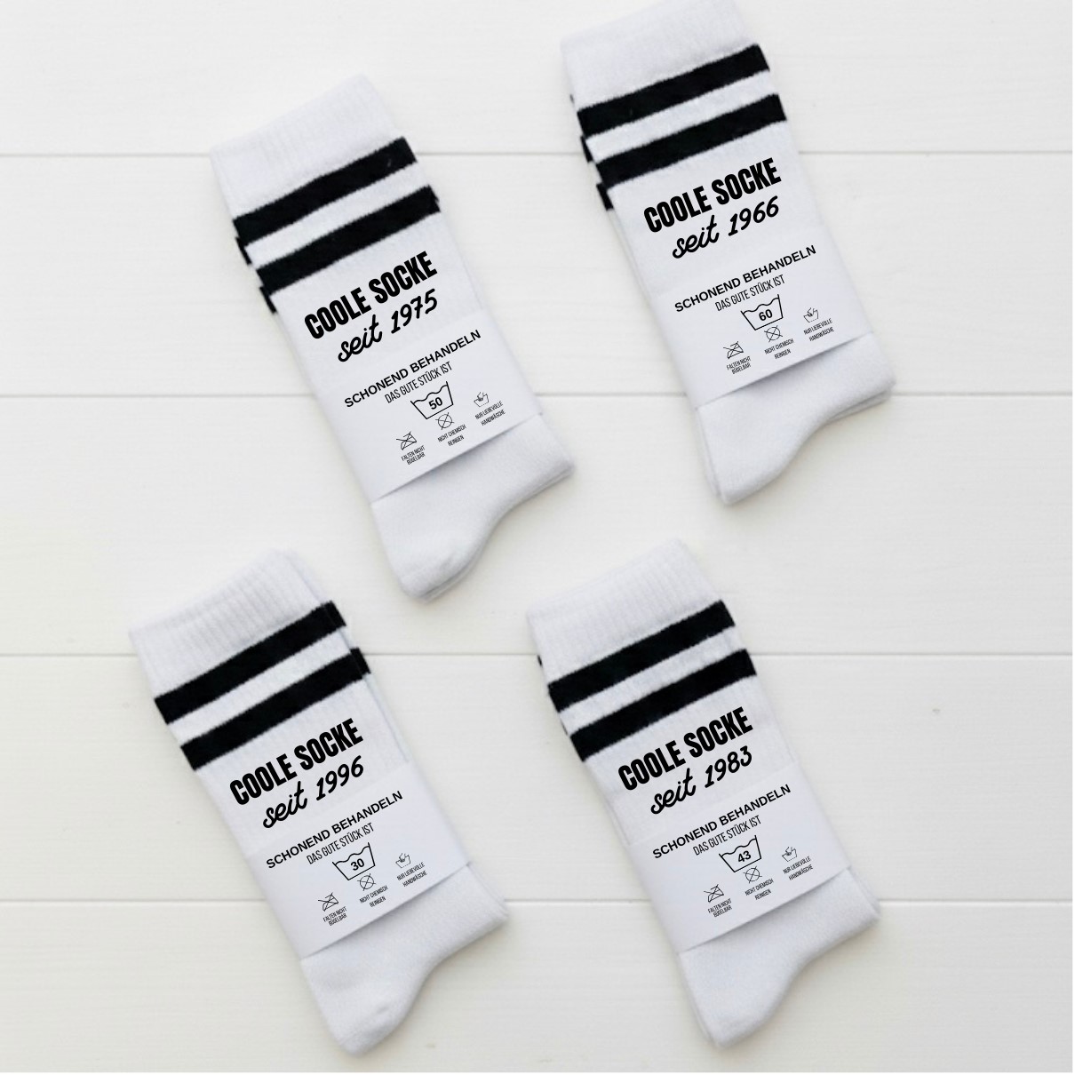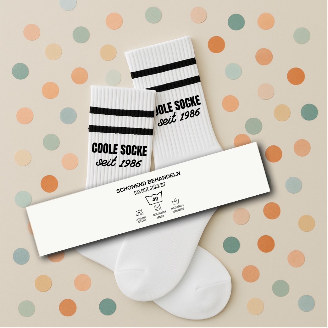 Der Jahrgang wird individuell für dich aufgebracht. Perfekt für alle, die zeigen möchten, dass sie schon seit vielen Jahren eine richtig coole Socke sind. Besonders beliebt als Geschenk zu runden Geburtstagen oder als kleine Aufmerksamkeit mit persönlicher Bedeutung.