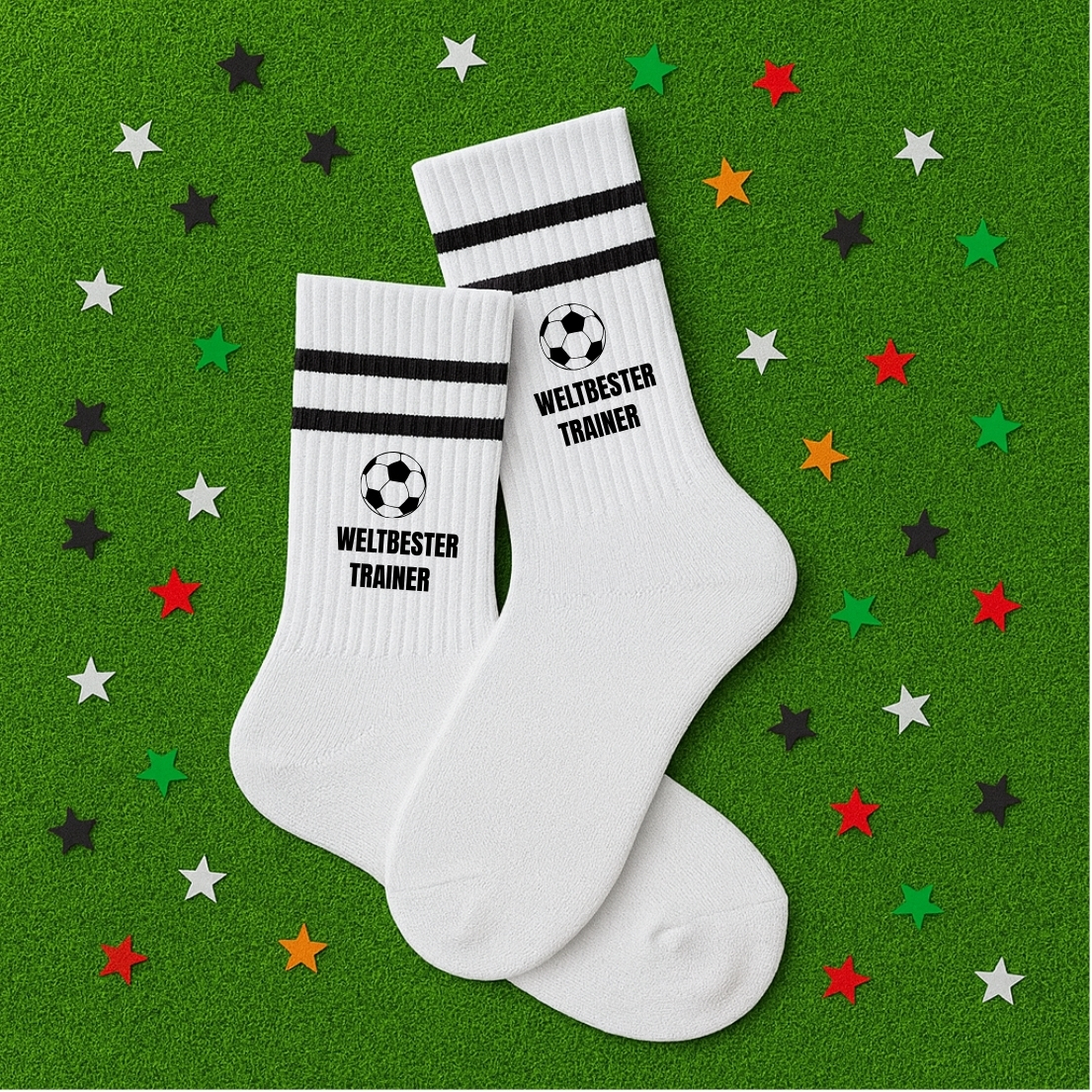 - Sportsocken mit Aufdruck „Weltbester Trainer“ oder „Weltbeste Trainerin“