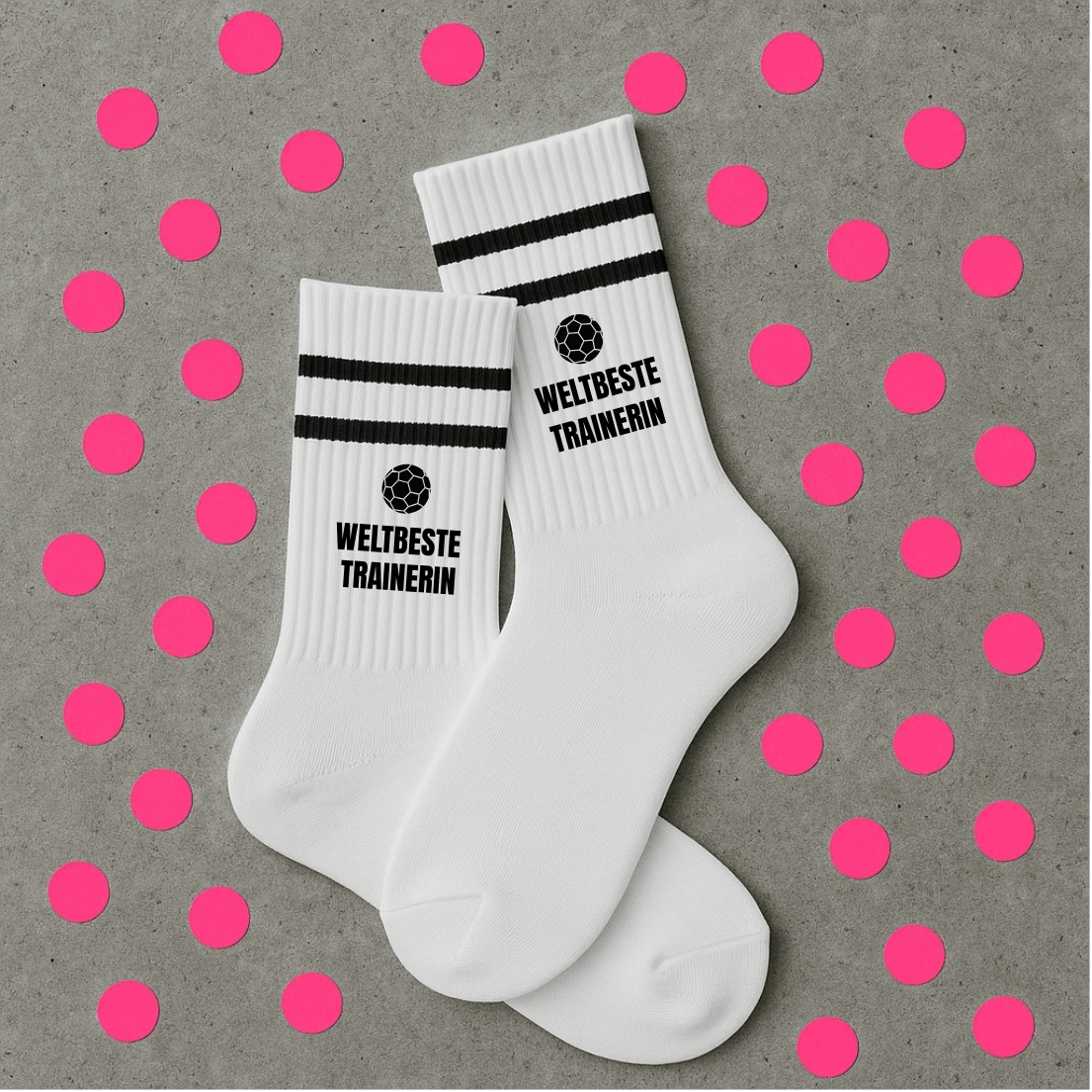 Die Sportsocken sind mit dem Aufdruck „Weltbester Trainer“ oder „Weltbeste Trainerin“ erhältlich. So kannst du das Geschenk perfekt auf die beschenkte Person abstimmen. Bequem, sportlich und mit echter Bedeutung – ideal für Training, Spieltag oder Alltag.