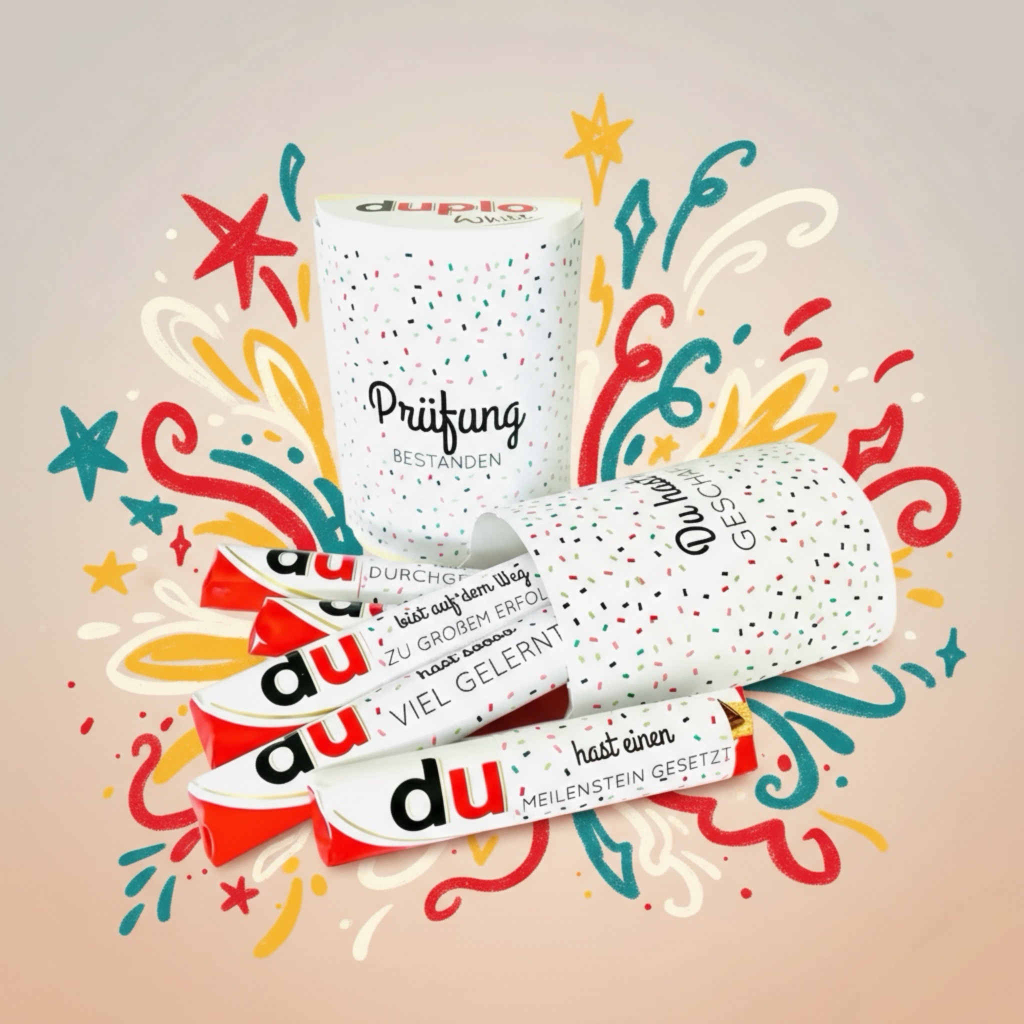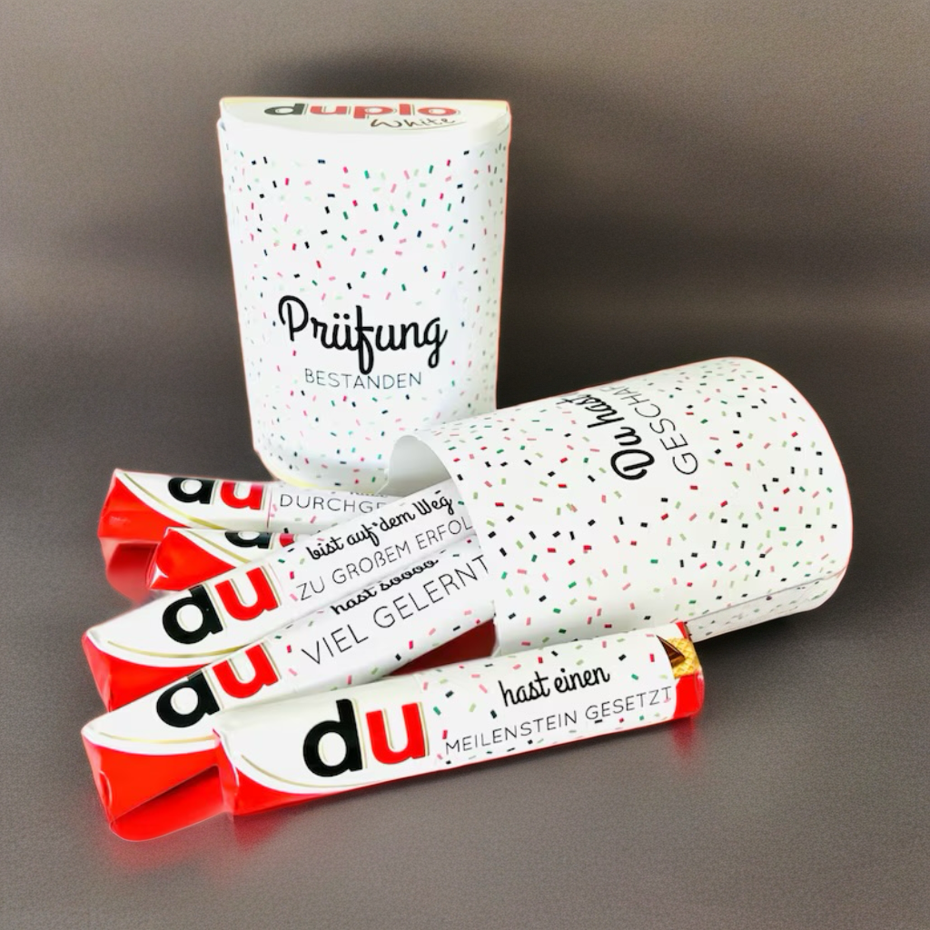 Im Download enthalten sind insgesamt 27 unterschiedliche Banderolen mit Sprüchen zur bestandenen Prüfung. Die Motive sind passend für Prüfungen im Allgemeinen sowie für Abitur, Bachelor, Master oder Doktor gestaltet und eignen sich perfekt für die klassischen Duplo-Schokoriegel. Eine Standardpackung enthält 10 Riegel, sodass sich theoretisch sogar zwei Geschenksets gestalten lassen.