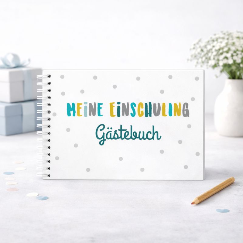 Dieses Gästebuch ist eine wunderschöne Erinnerung an den Einschulungstag und eignet sich ideal für die Einschulungsparty. Passend zu diesem Design bieten wir auch Schokobanderolen für die Tischdekoration an.