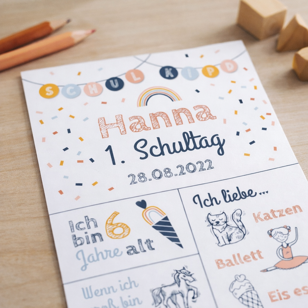 Unsere Einschulungstafel ist ein hochwertiger Druck im liebevoll gestalteten Rosa-Konfetti-Design. Sie wird individuell an die Interessen eures Kindes angepasst und mit viel Sorgfalt gestaltet. Dabei achten wir stets darauf, ansprechende und passende Motive auszuwählen.
