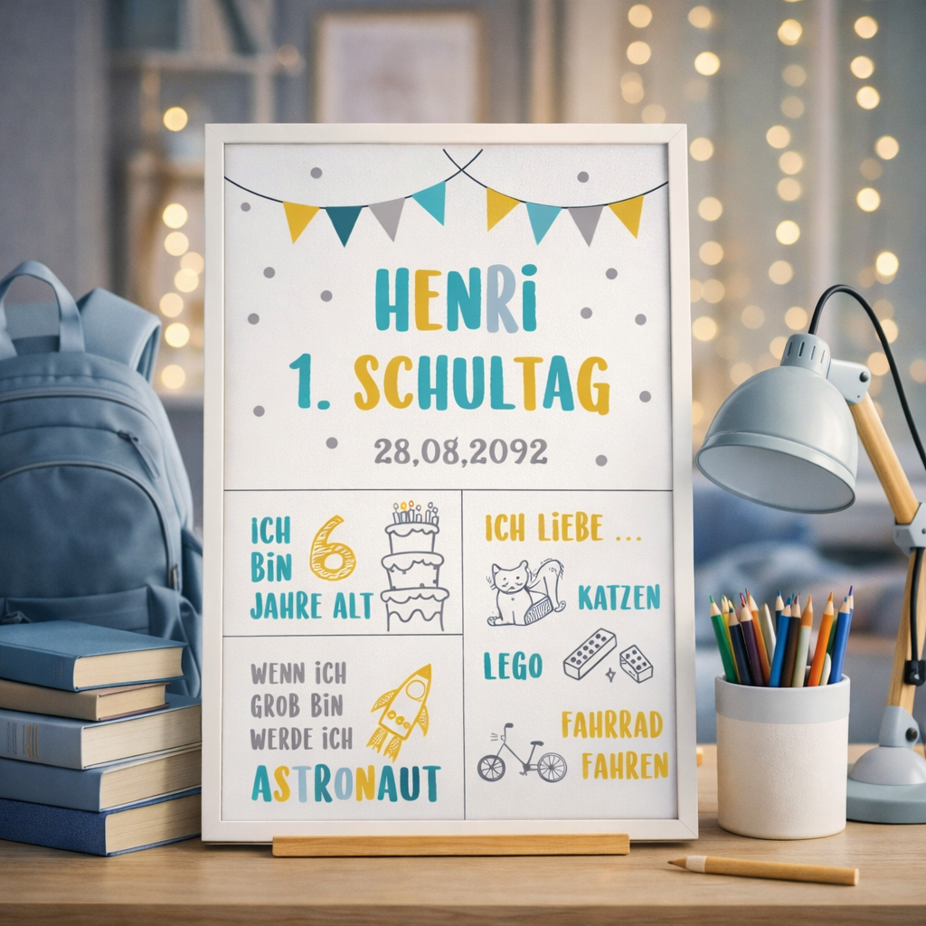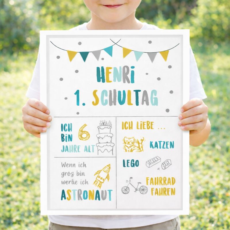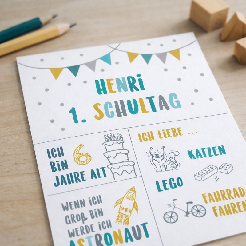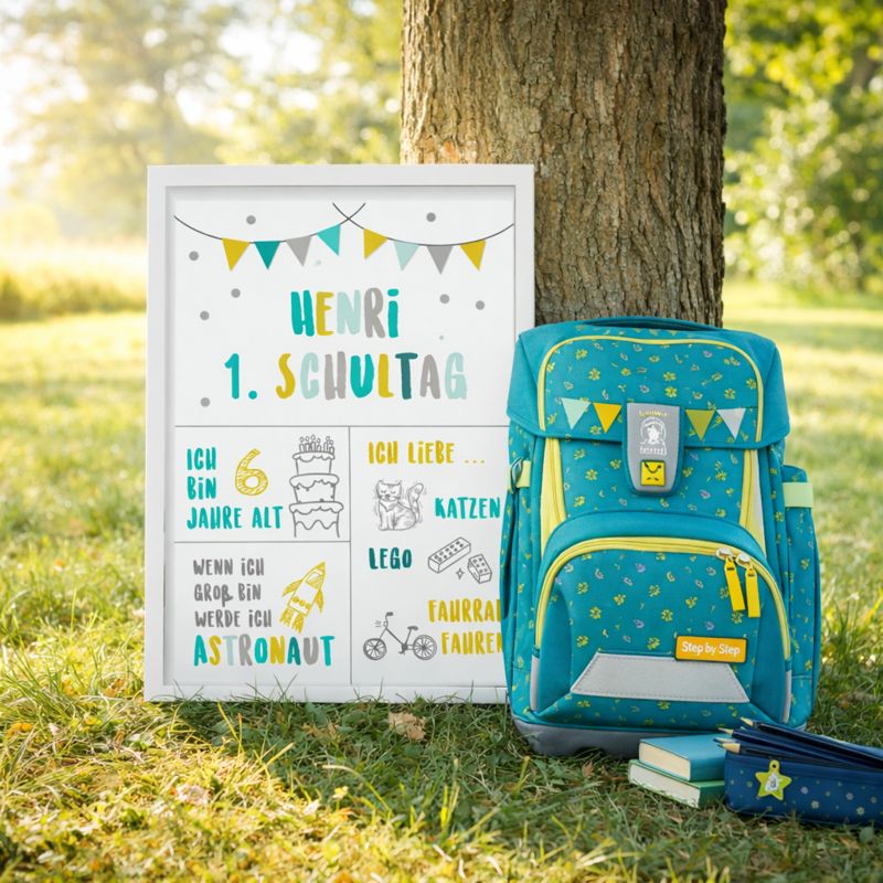 Unsere Einschulungstafel ist ein hochwertiger Druck im frischen Türkis-Design. Der Designdruck wird individuell an die Interessen eures Kindes angepasst und mit viel Sorgfalt gestaltet. Dabei achten wir stets darauf, ansprechende und passende Motive auszuwählen.