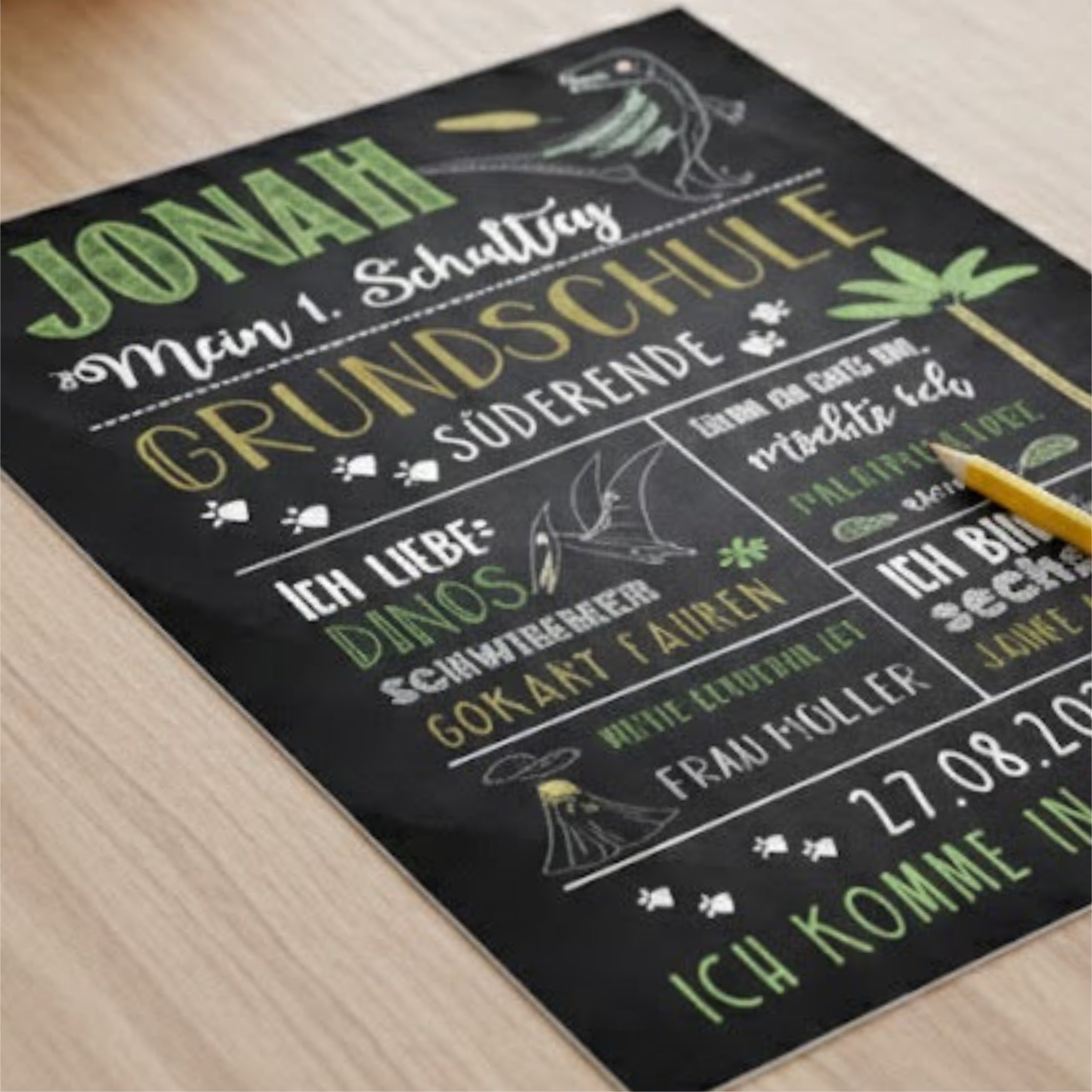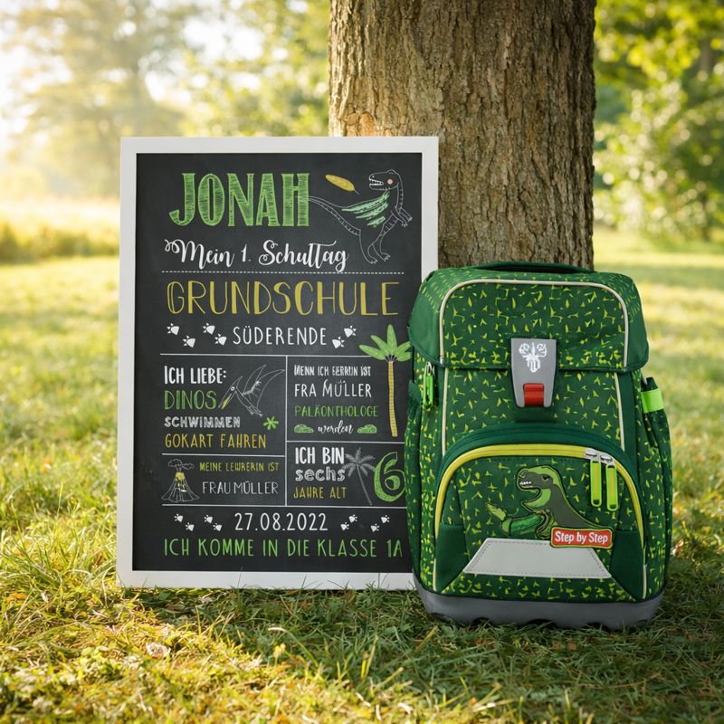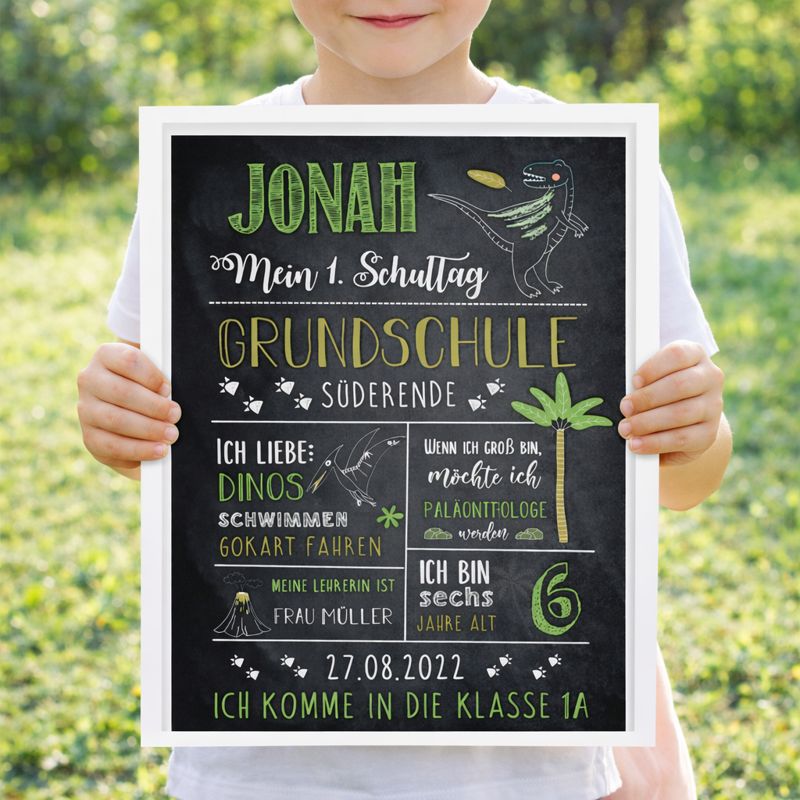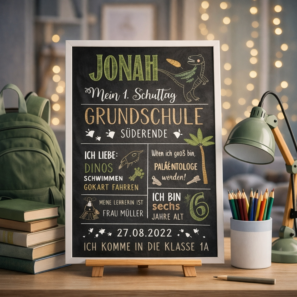 Diese Einschulungstafel ist ein hochwertiger Druck im liebevoll gestalteten Dino- und Paläontologen-Design. Sie wird individuell an die Interessen eures Kindes angepasst und mit viel Liebe zum Detail gestaltet. So entsteht eine persönliche Meilensteintafel, die perfekt zu kleinen Dino-Entdeckern passt.