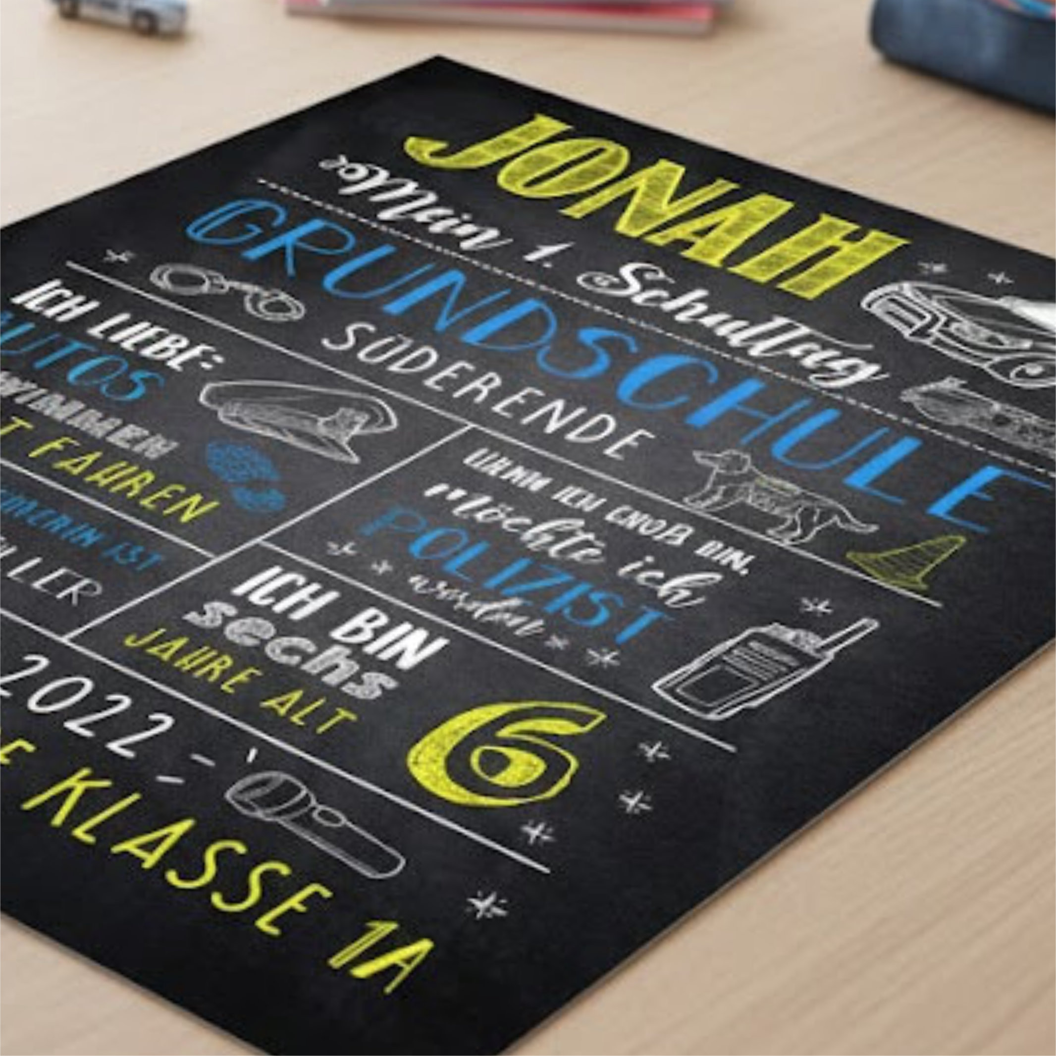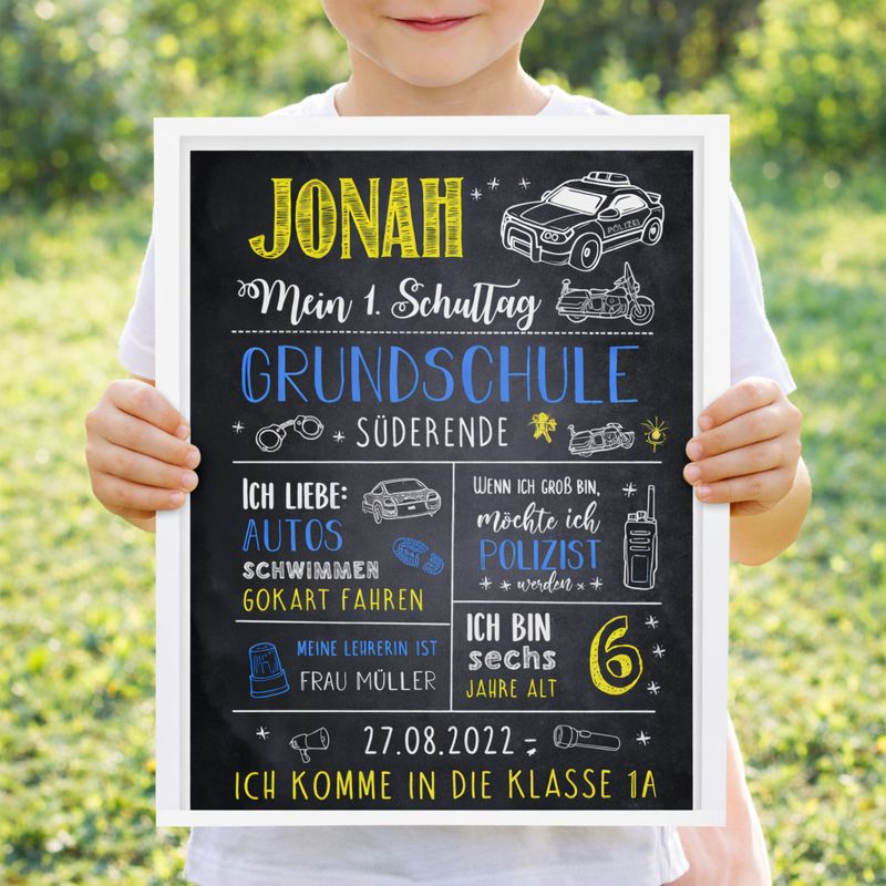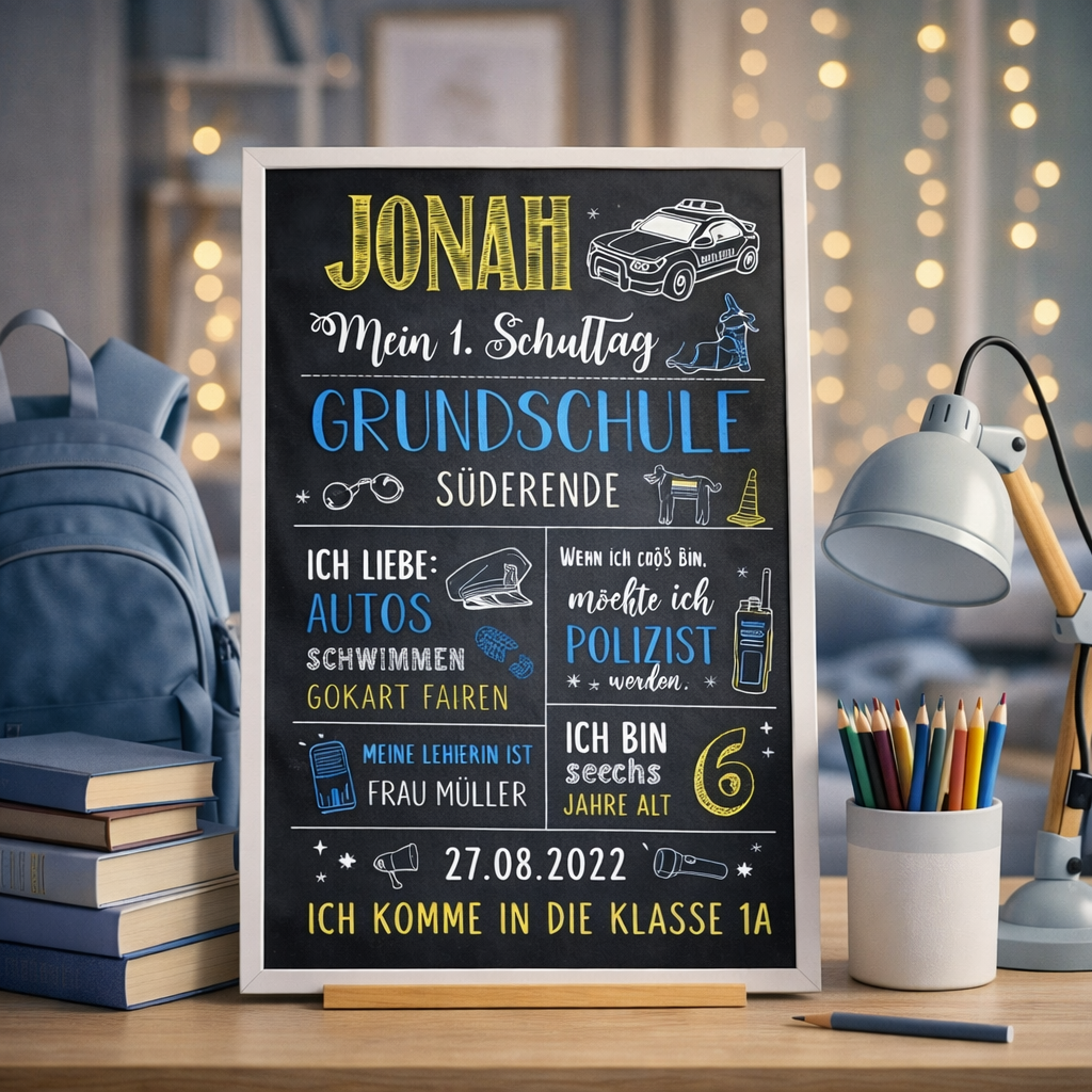 Diese Einschulungstafel ist ein hochwertiger Druck im liebevoll gestalteten Polizei-Design. Sie wird individuell an die Interessen eures Kindes angepasst und mit viel Liebe zum Detail gestaltet. So entsteht eine persönliche Meilensteintafel, die perfekt zu kleinen Polizei-Fans passt.