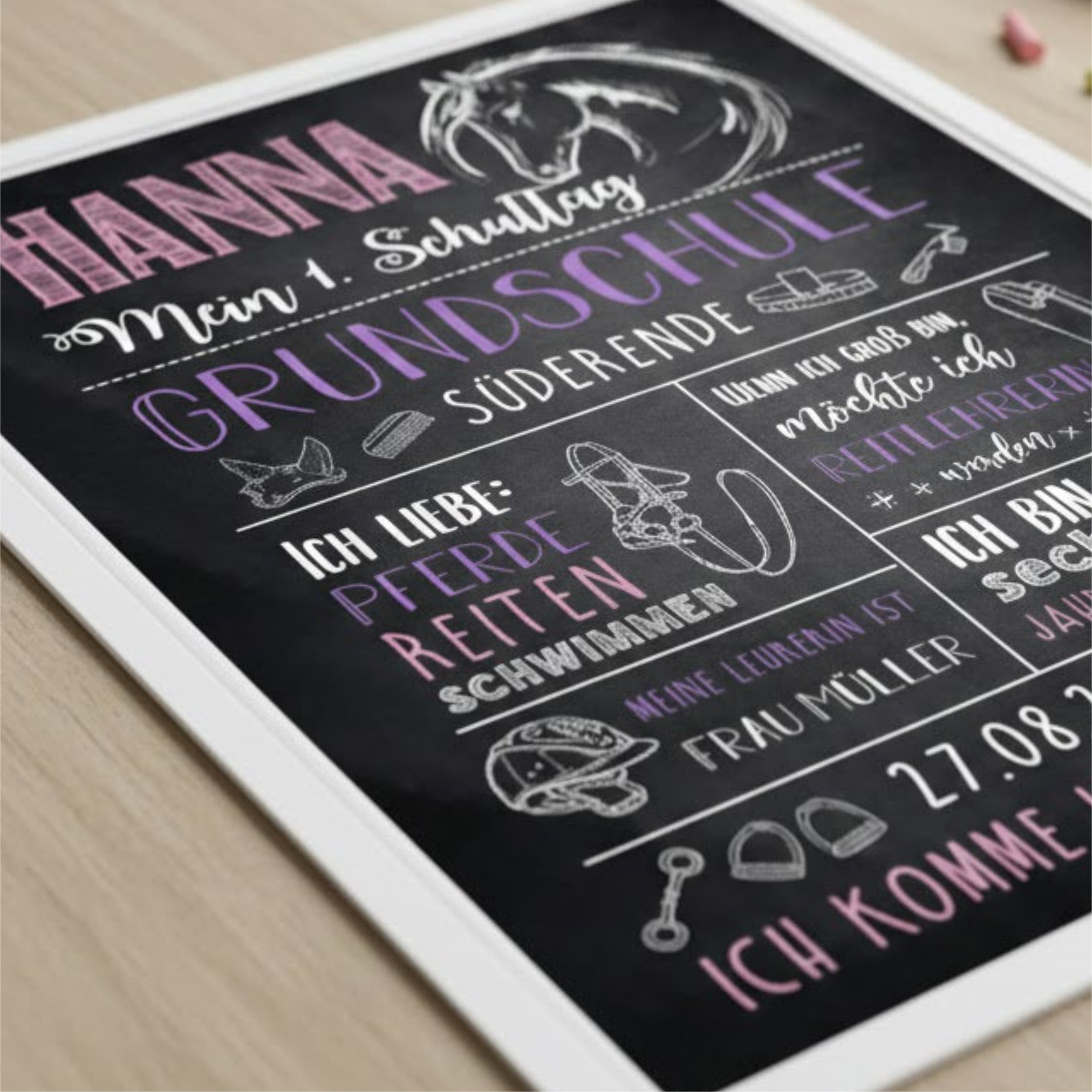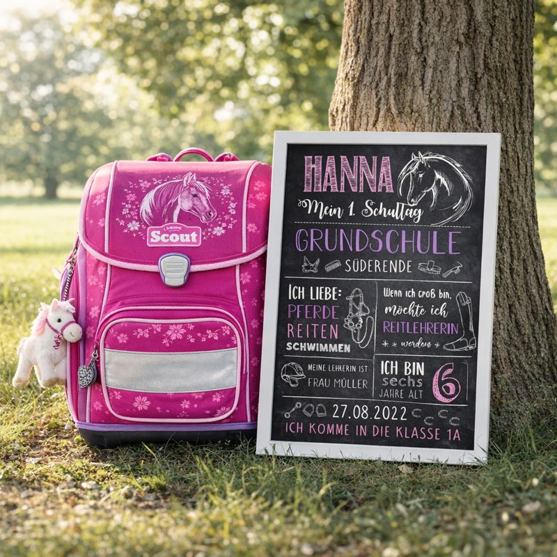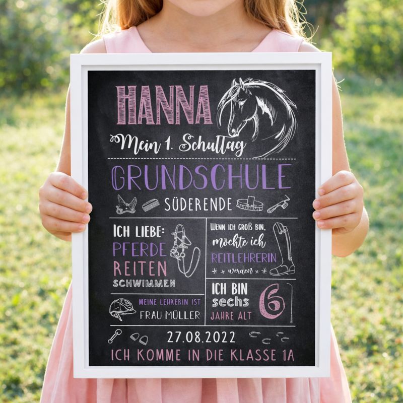 Diese Einschulungstafel ist ein hochwertiger Druck im liebevoll gestalteten Pferde- und Reitdesign. Sie wird individuell an die Interessen eures Kindes angepasst und mit viel Liebe zum Detail gestaltet. So entsteht eine persönliche Meilensteintafel, die perfekt zu kleinen Pferdefans passt.