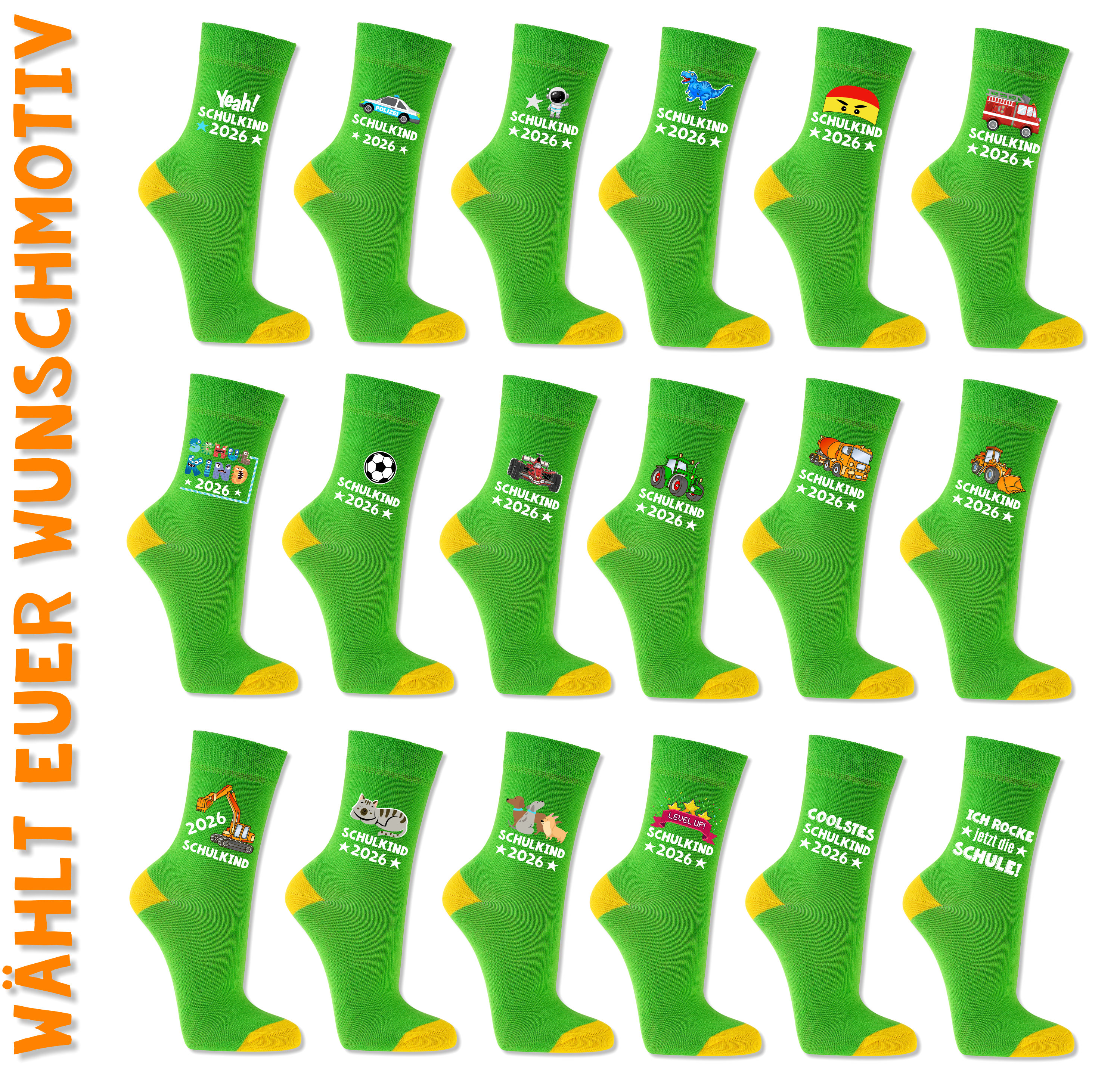 Für diese grüne Schulkind Socke stehen viele unterschiedliche Motive zur Auswahl. So findet jedes Schulkind genau das Design, das am besten zu ihm passt.