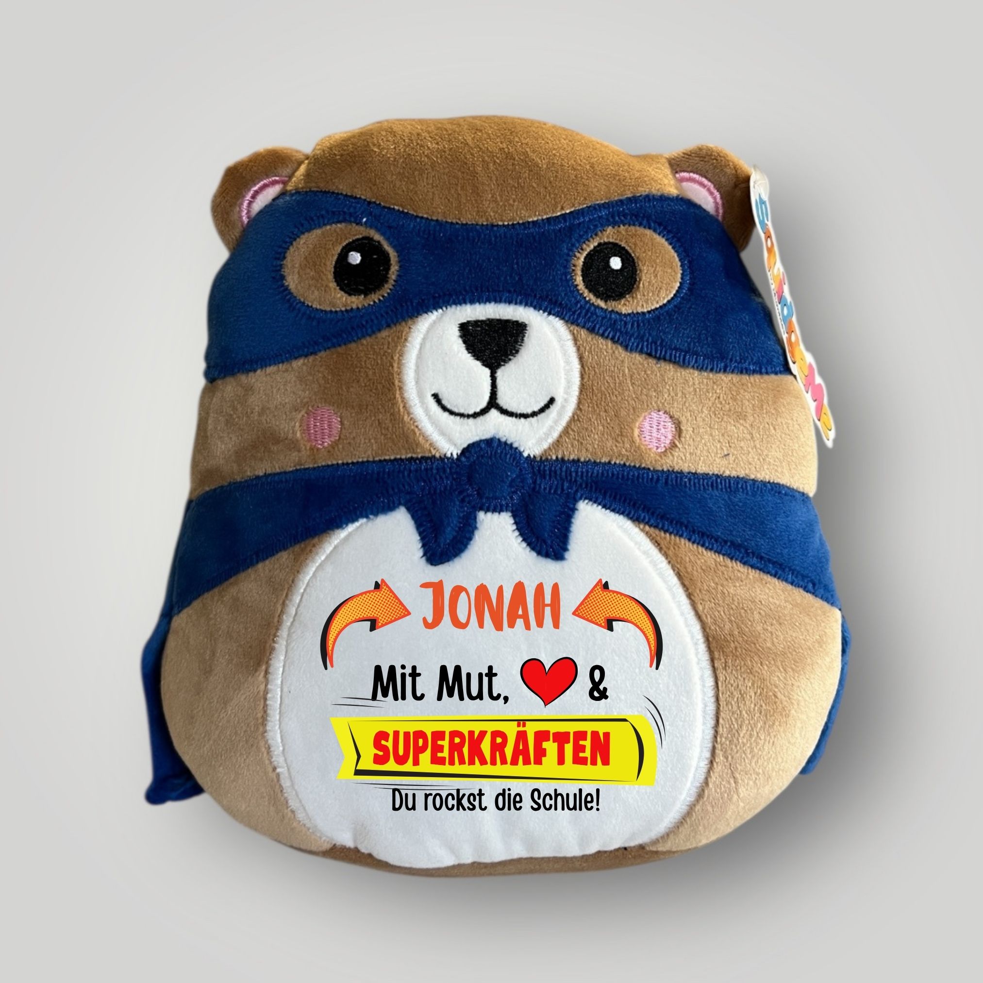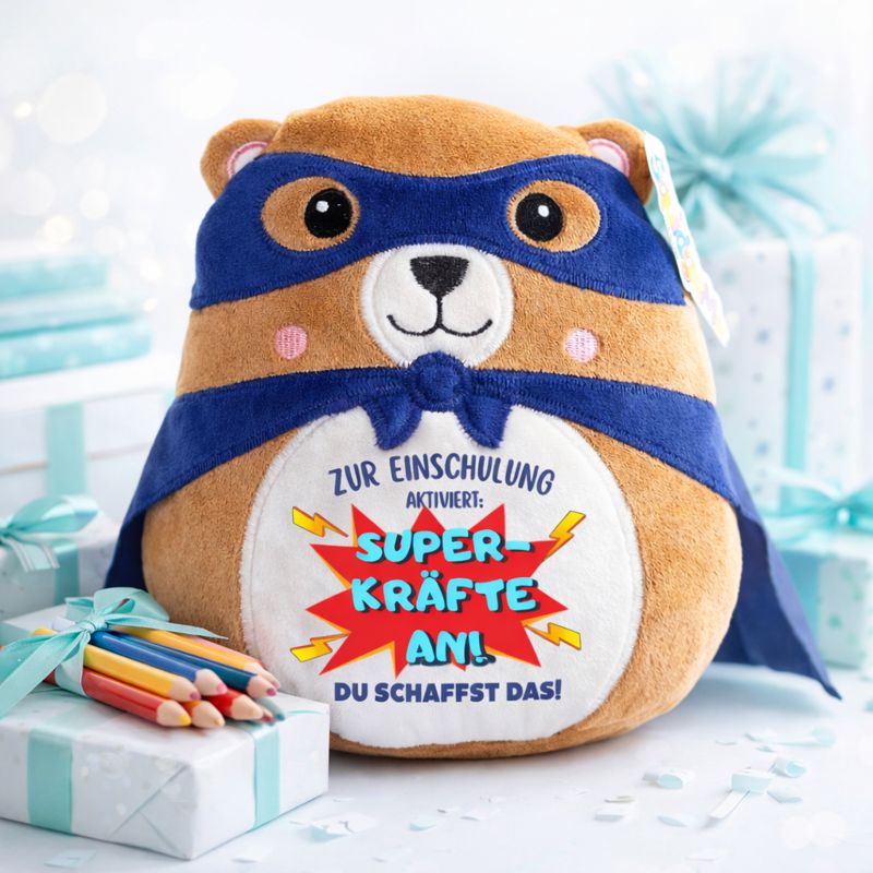 Mit Heldencape, Maske und deinem Wunschnamen wird der flauschige Bär zu einem ganz persönlichen Superhelden. Er begleitet dein Schulkind am Einschulungstag, spendet Trost bei den ersten Hausaufgaben und ist ein treuer Freund beim Einschlafen.