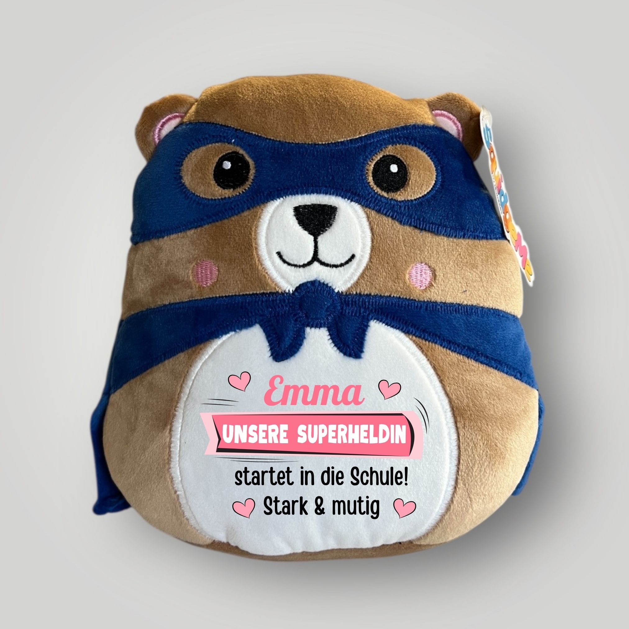 Heute beginnt ein neues Abenteuer. Und jeder Held braucht einen treuen Begleiter. Dieser personalisierte Superhelden-Bär ist mehr als nur ein Kuscheltier – er schenkt Mut, Geborgenheit und Selbstvertrauen zum Start in die Schulzeit.