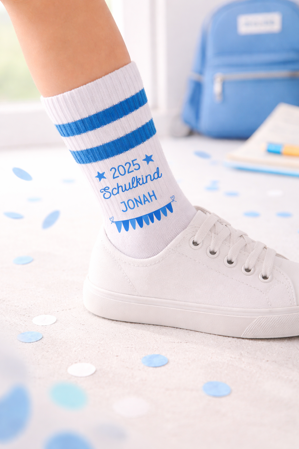 Hurra, die Schule geht los! Mit unseren coolen Schulkind Socken mit Namen startet euer Kind perfekt in den großen Tag der Einschulung. Die leuchtenden Farben und der persönliche Name machen die Socken zu einem ganz besonderen Highlight im Einschulungsoutfit.