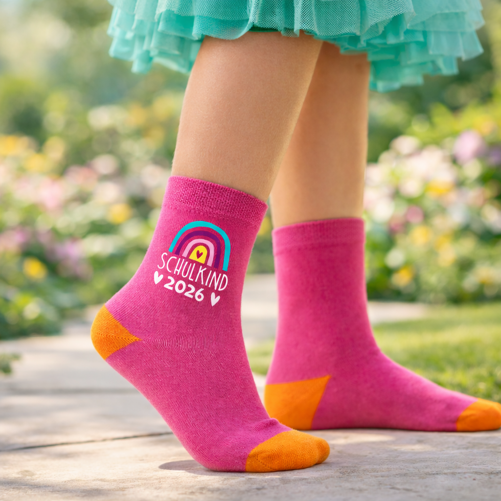 Hurra, die Schule geht los. Mit unseren super coolen Schulkind Socken macht der Schulstart gleich doppelt Spaß. Die pinken Socken sind ein fröhliches Accessoire für das Einschulungsoutfit kleiner Erstklässlerinnen.