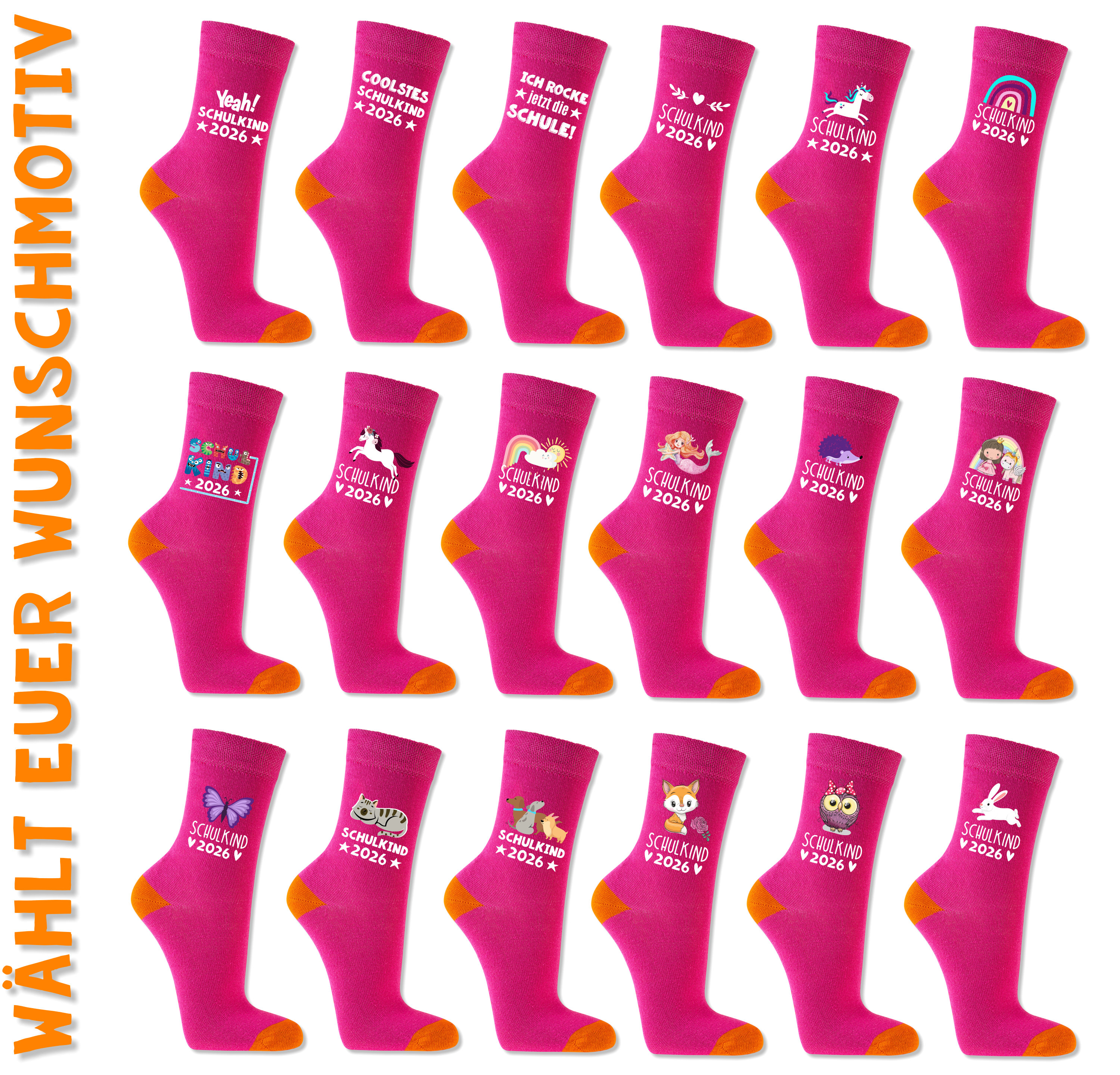 Für diese pinke Socke stehen über 18 unterschiedliche Motive zur Auswahl. So findet jedes Schulkind genau das Design, das am besten zu ihm passt.