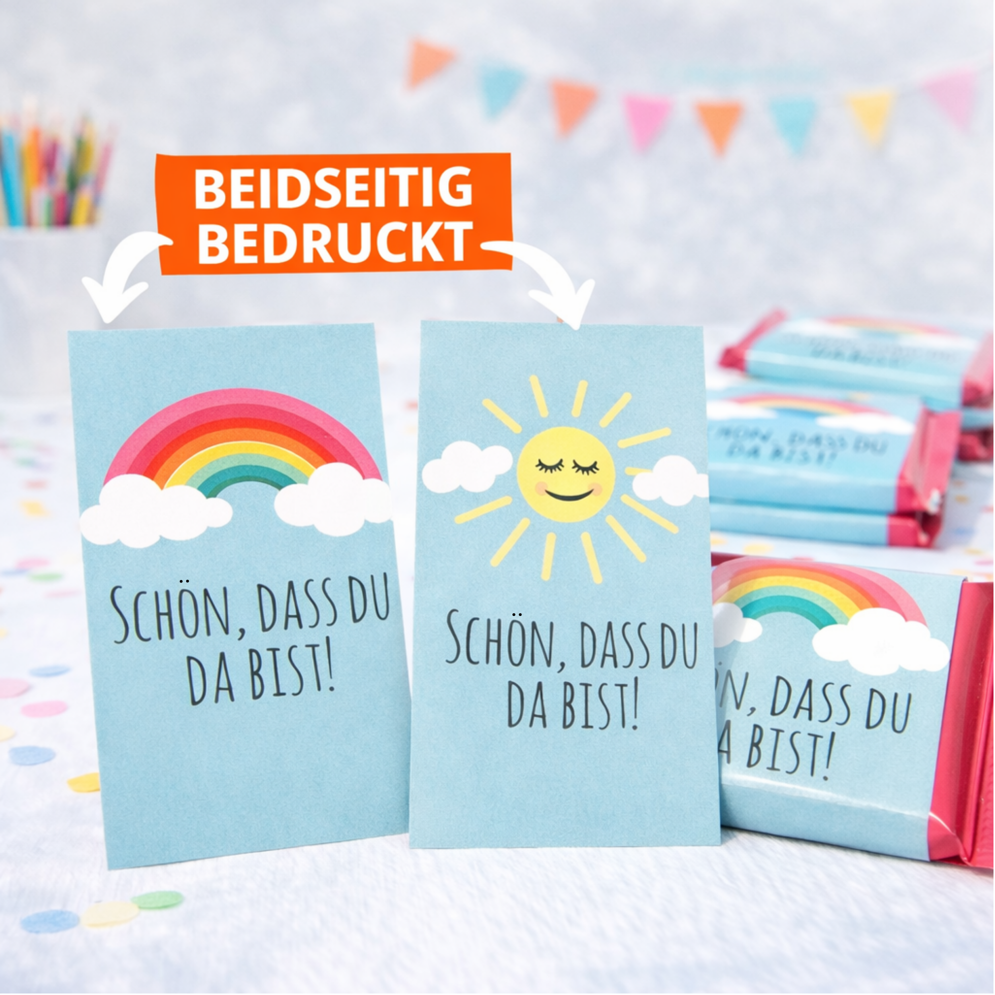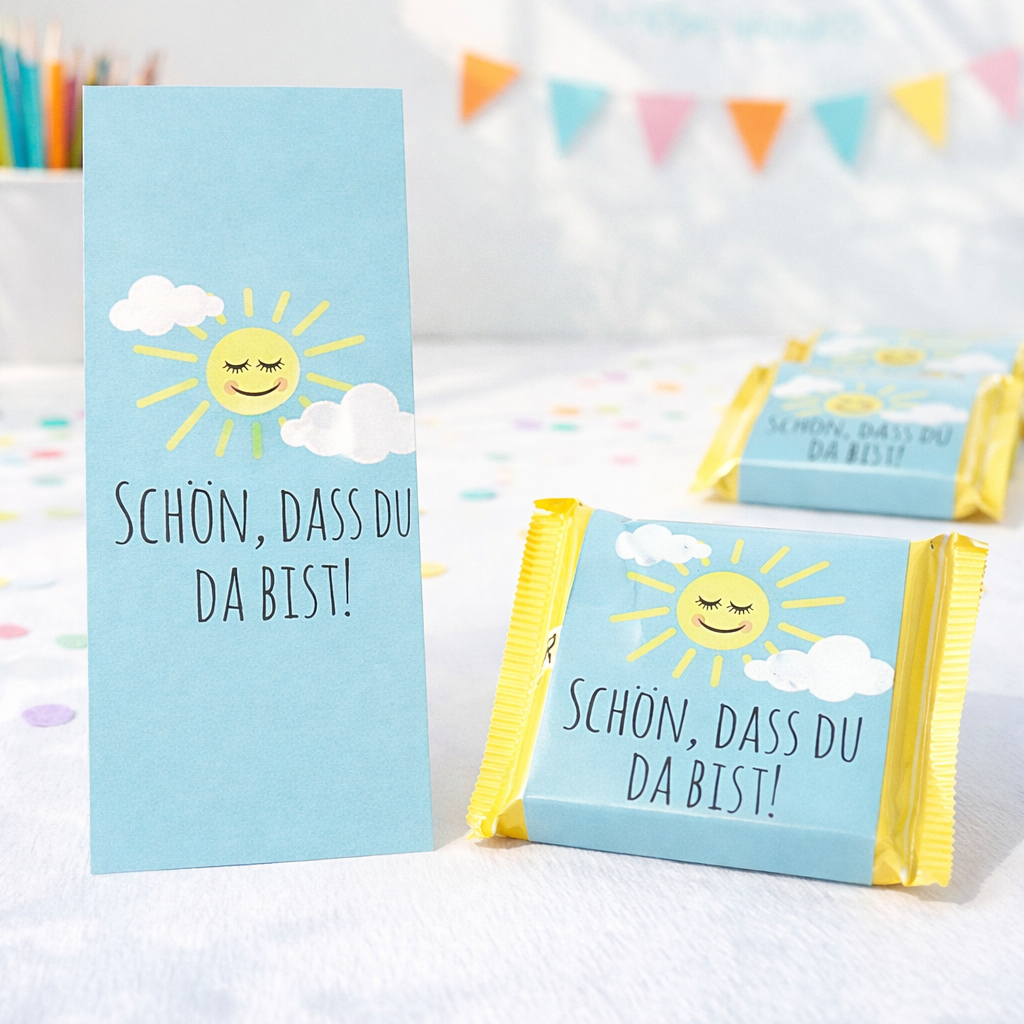 Ob zur Taufe, Kommunion, Konfirmation, zum Schulanfang oder als liebevolles Dankeschön für eure Gäste – das freundliche Sonnenmotiv passt wunderbar zu festlichen und fröhlichen Anlässen.