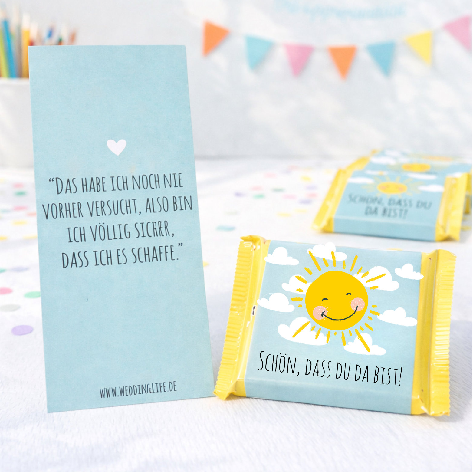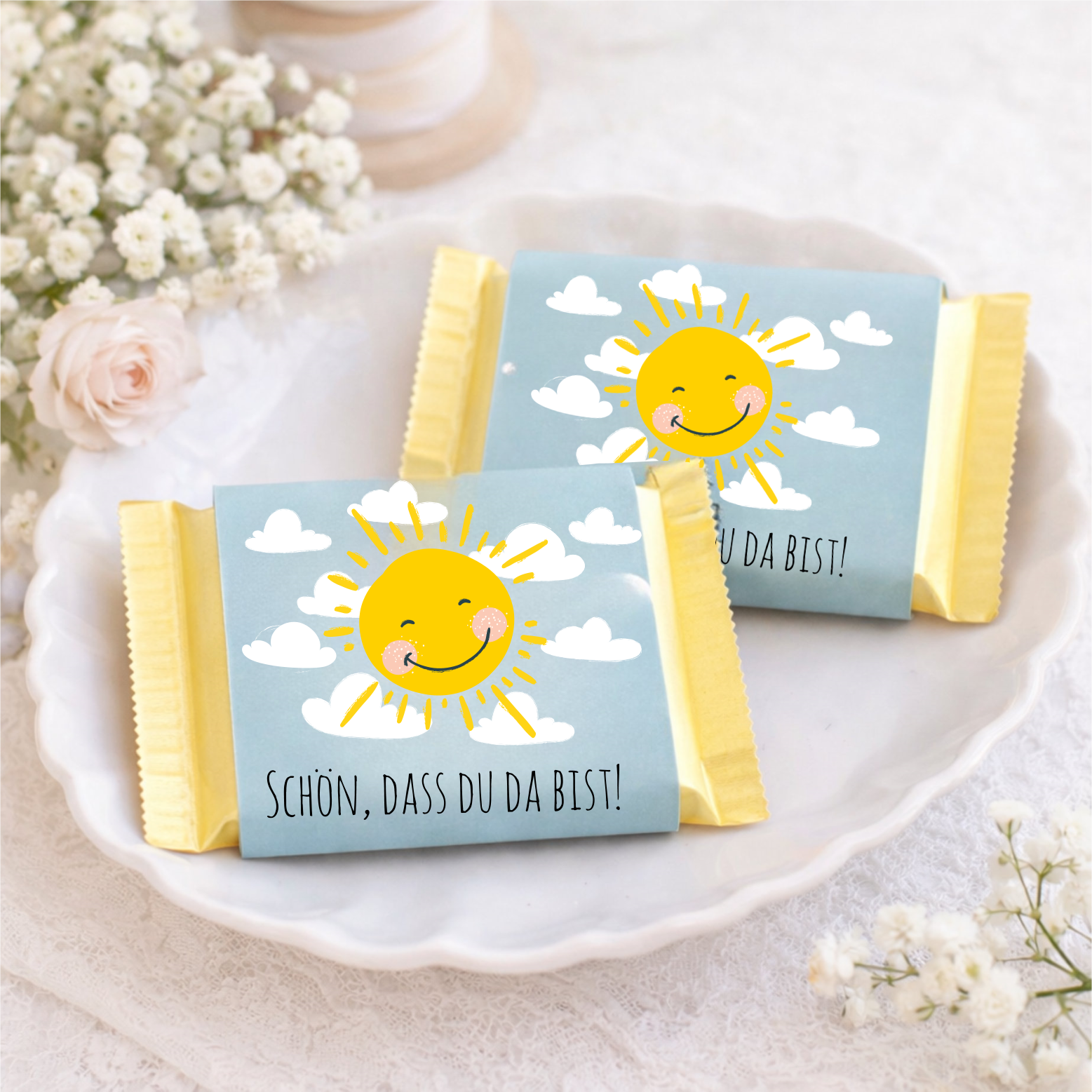 Ob zur Taufe, Kommunion, Konfirmation, zum Schulanfang oder als liebevolles Dankeschön für eure Gäste – das freundliche Sonnenmotiv passt wunderbar zu festlichen und fröhlichen Anlässen.
