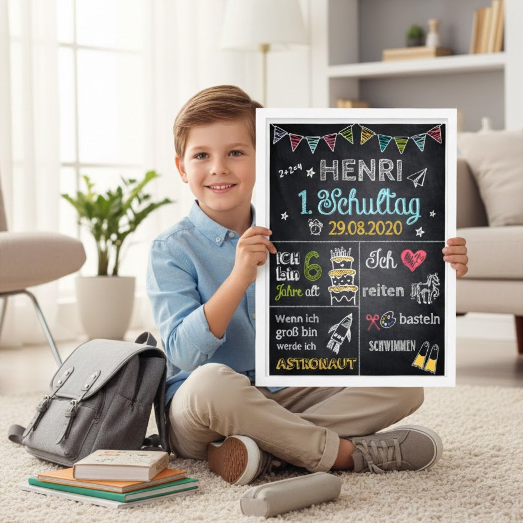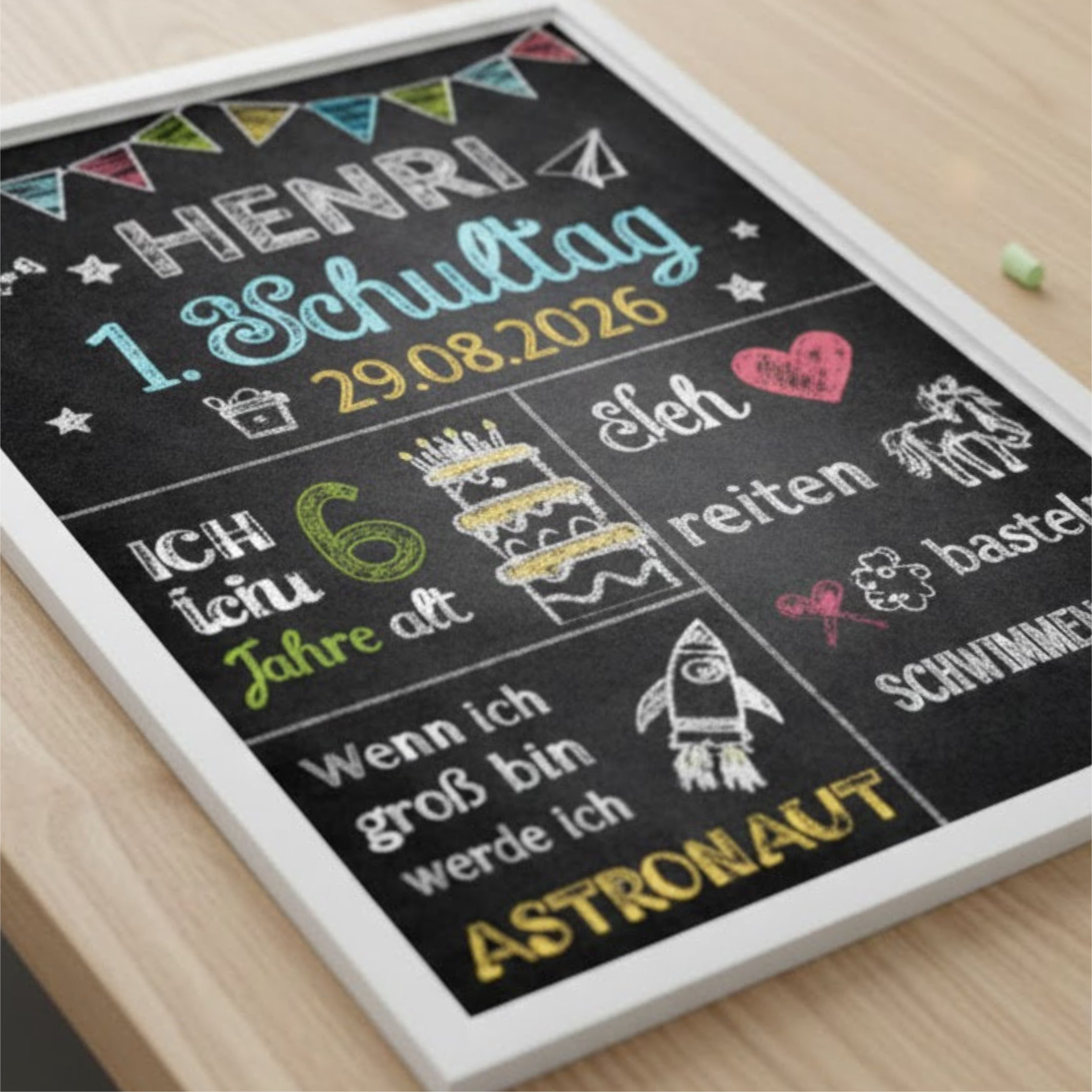 Unsere Einschulungstafel ist ein hochwertiger Druck im fröhlichen Tafel- bzw. Kreidedesign. Sie wird individuell an die Interessen eures Kindes angepasst und mit viel Liebe zum Detail gestaltet. So entsteht eine persönliche Meilensteintafel, die perfekt zum Schulkind passt.