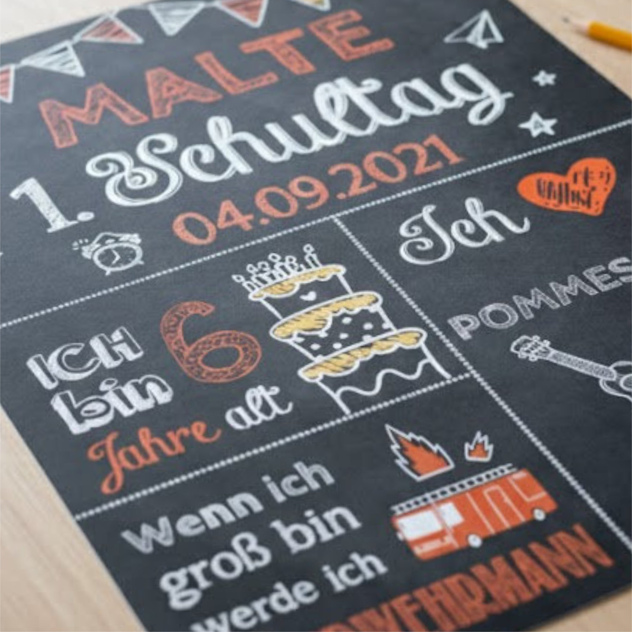 Unsere Einschulungstafel ist ein hochwertiger Druck im klassischen Tafel- bzw. Kreidedesign in Grün und Rot. Sie wird individuell an die Interessen eures Kindes angepasst und mit viel Sorgfalt gestaltet. Dabei achten wir stets darauf, ansprechende und passende Motive auszuwählen.