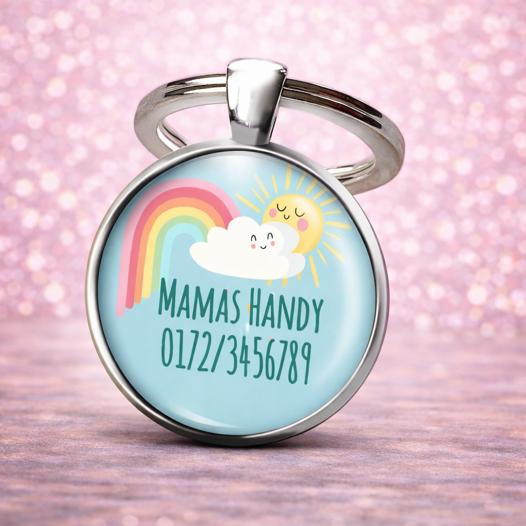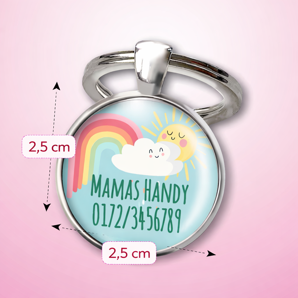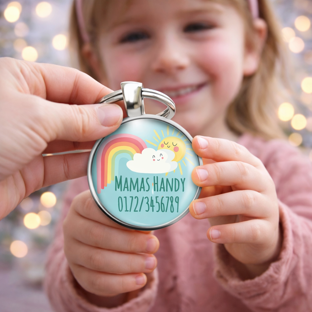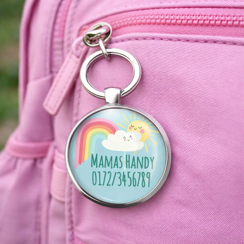 Einschulung Geschenk | Notfallnummer Anhänger – Motiv Sonne Regenbogen