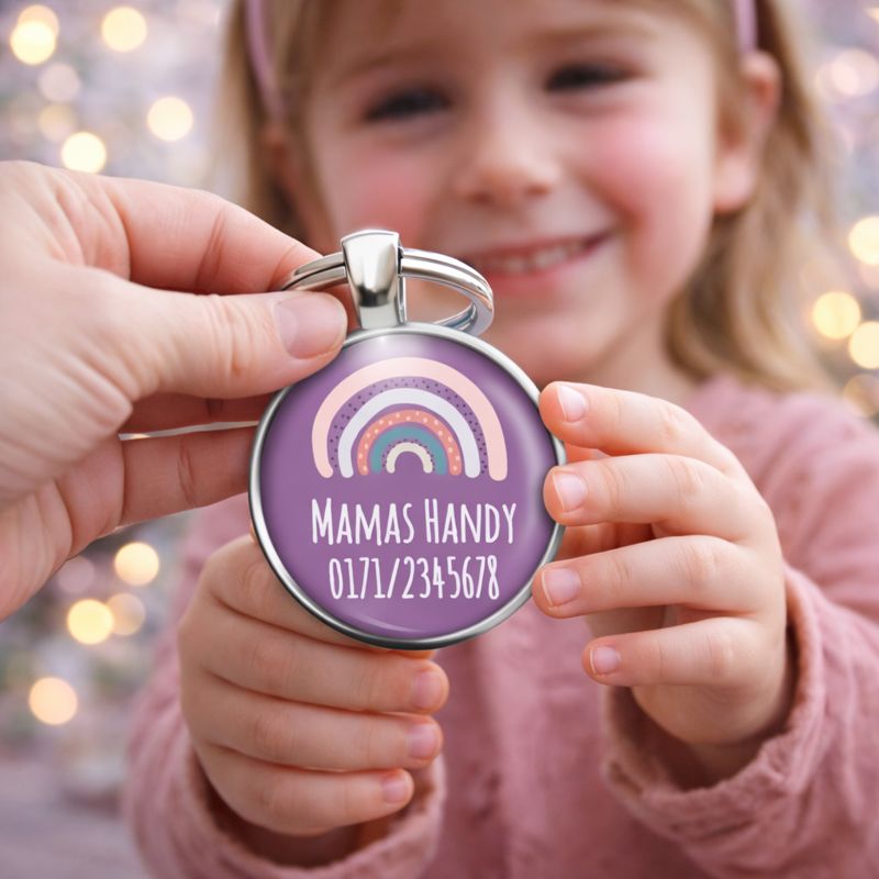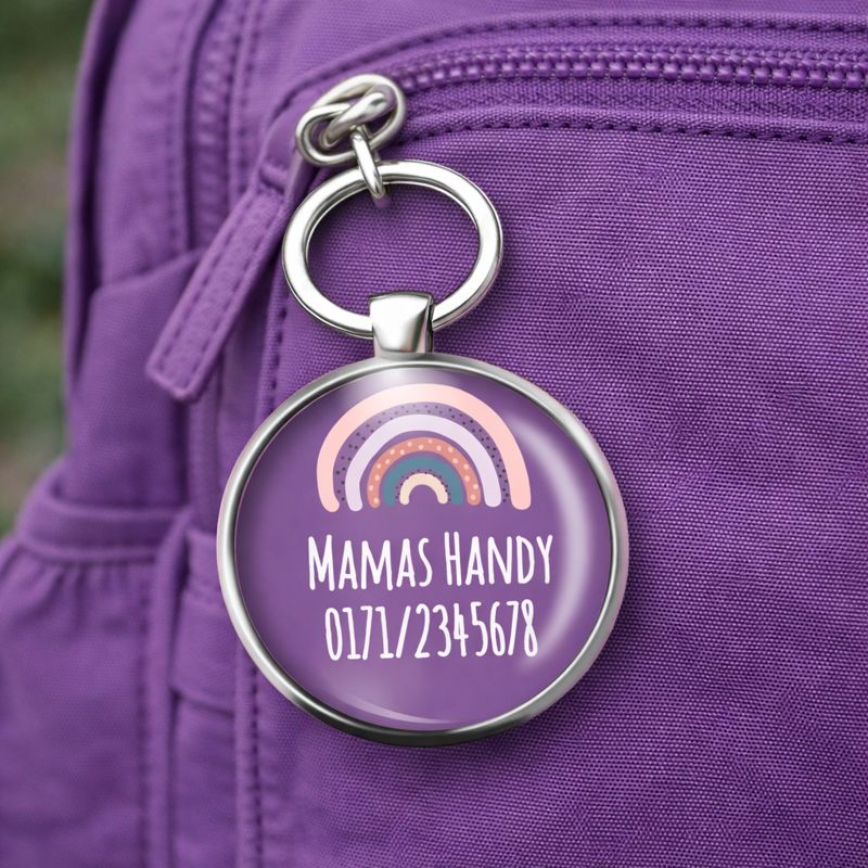 Einschulung Geschenk | Notfallnummer Anhänger – Motiv lila Regenbogen