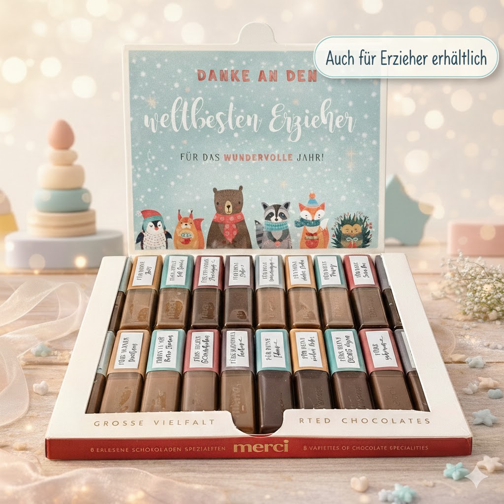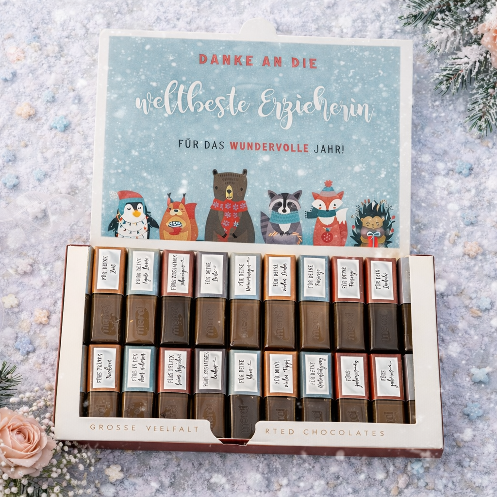 Ein zauberhaftes Weihnachtsgeschenk für Erzieherinnen, die unsere Kinder jeden Tag liebevoll begleiten und Eltern im Alltag den Rücken freihalten. Mit diesem Aufkleber Set wird aus einer klassischen Merci-Schachtel im Handumdrehen ein persönliches Dankeschön zu Weihnachten.