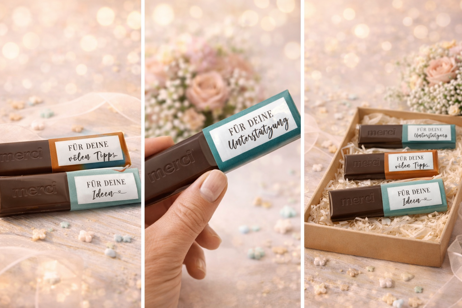 - ✔ 1 großer „Danke“-Aufkleber für die Innenseite der Merci-Schachtel