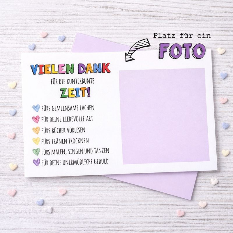 Besonders schön: Die Karte ist ohne glänzenden Lack gestaltet, damit Kinder neben dem Text noch ein kleines Bild malen können. So wird aus der Karte ein ganz persönliches Erinnerungsstück.