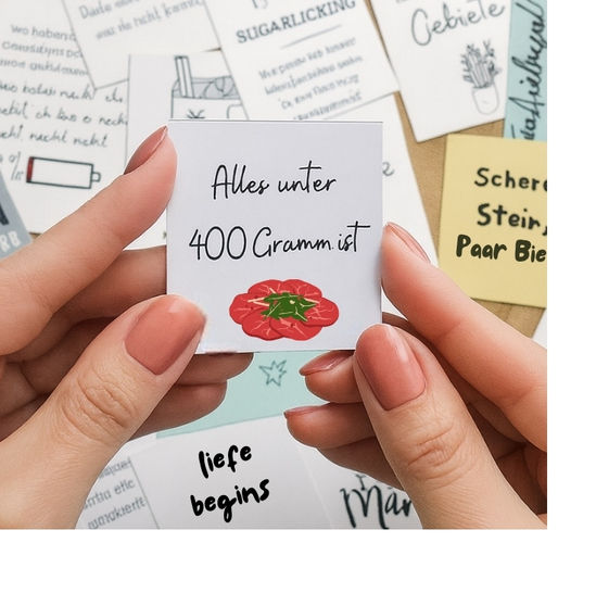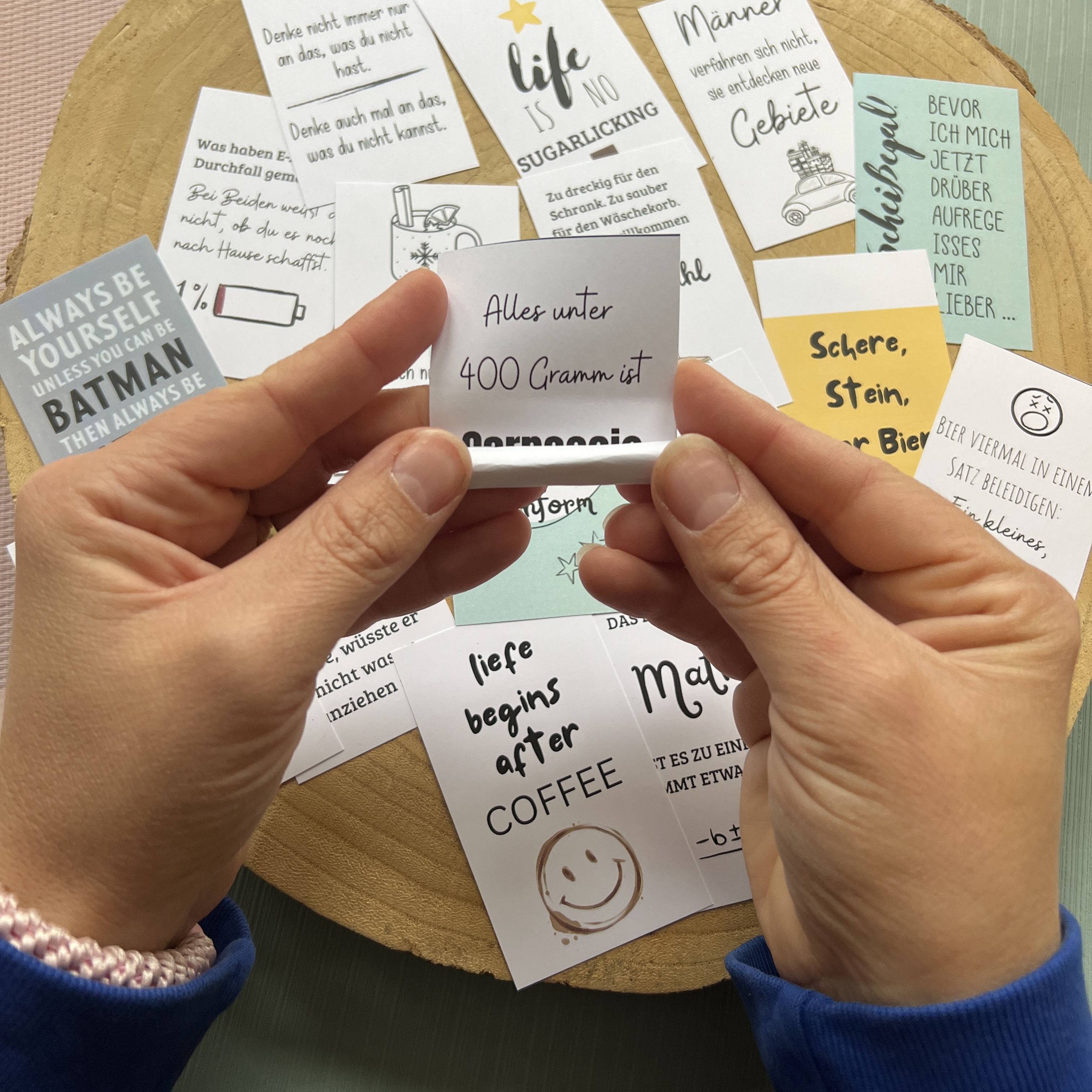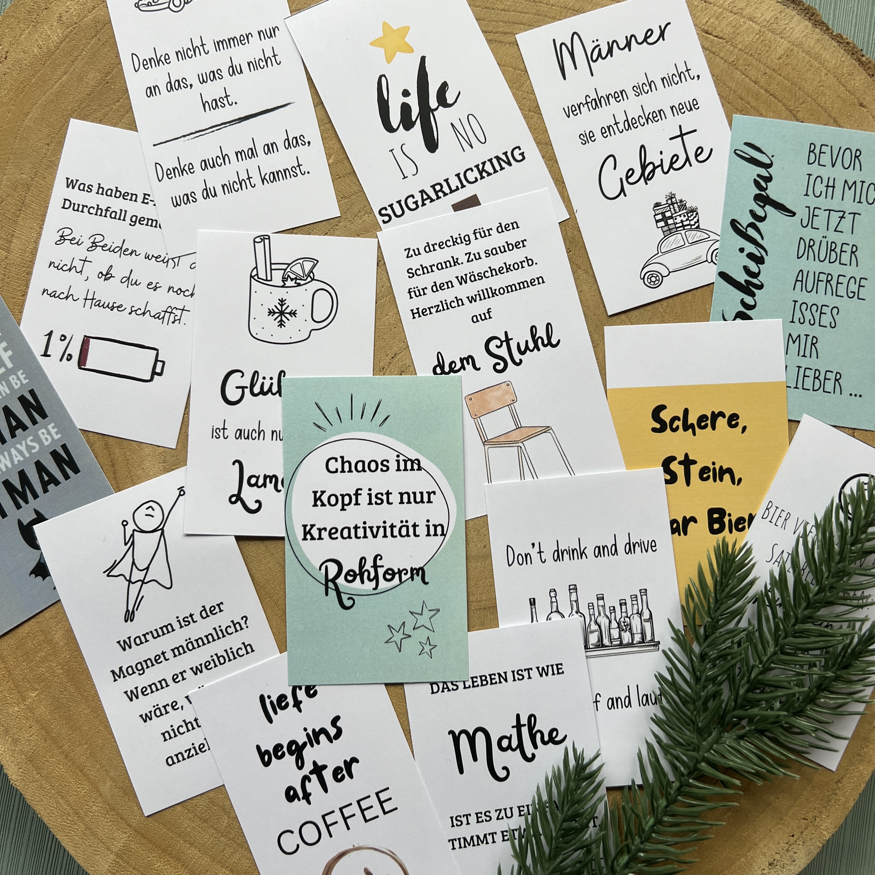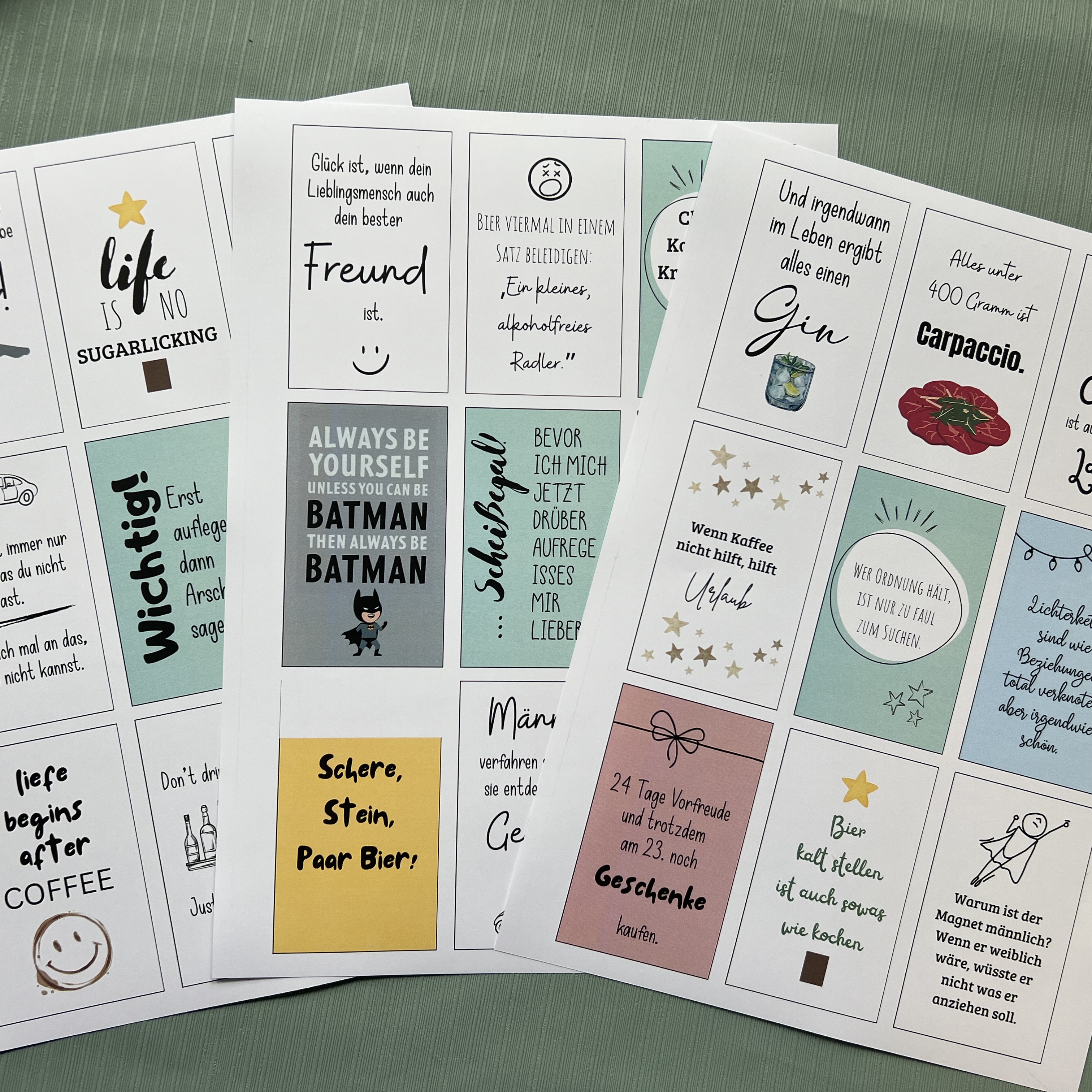 Enthalten sind 27 Sprüche (falls einer nicht ganz passt ?) und einen Topper zum Verschließen des Kalenders.
