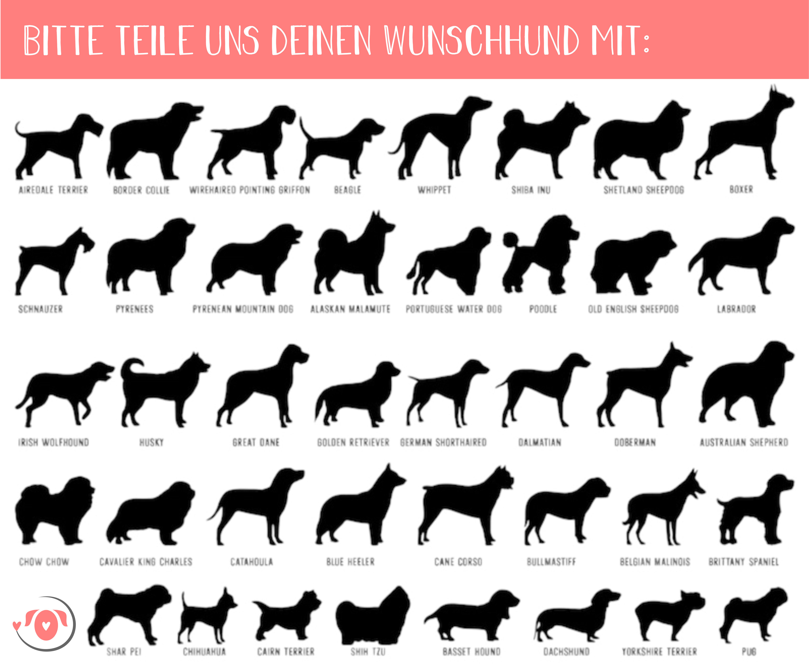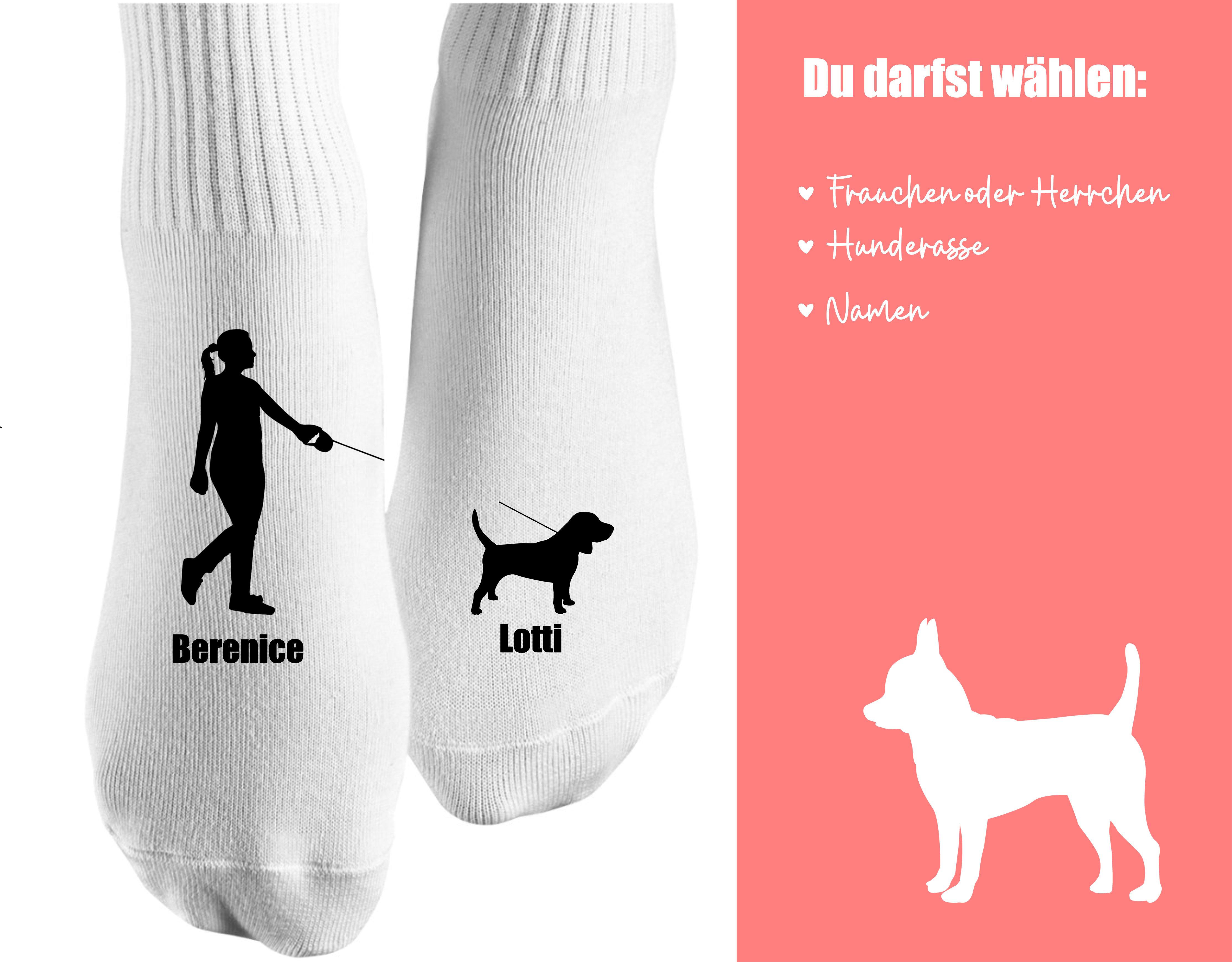 Wählt einfach aus, ob die Socken für eine Frau oder einen Mann sein sollen und schreibt zu dem Namen des Hundes auch die Rasse. Die möglichen Hunderassen seht ihr auf dem Schaubild.