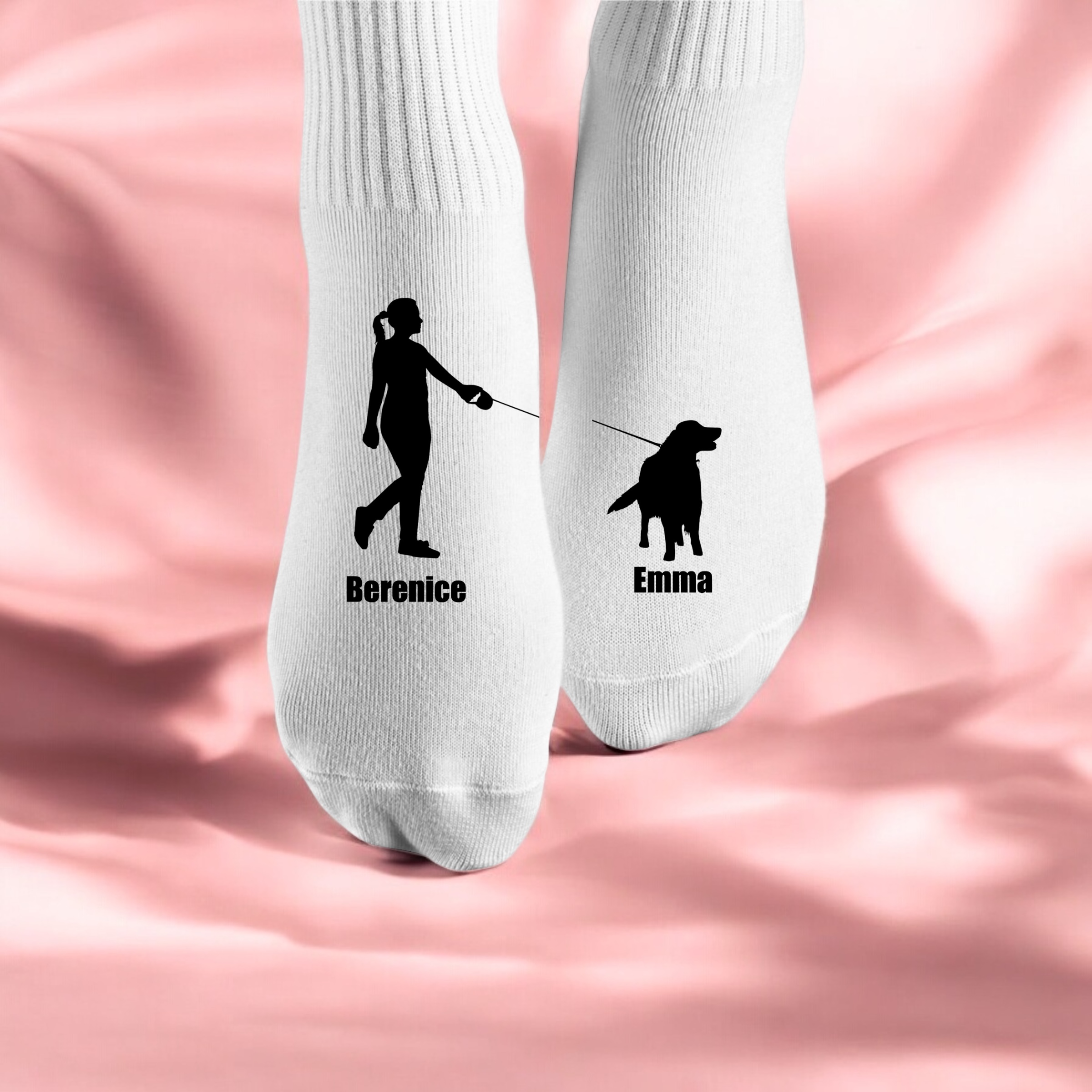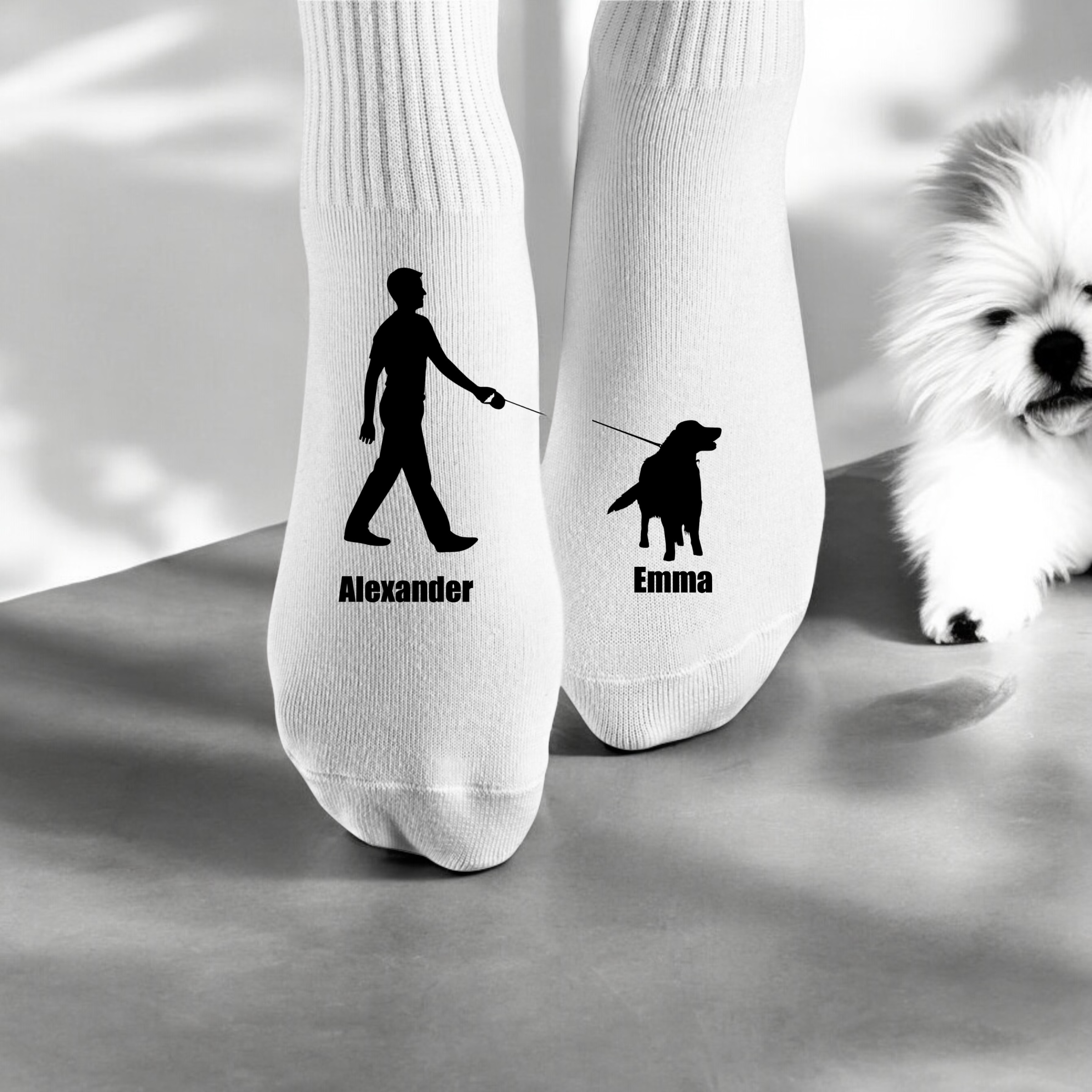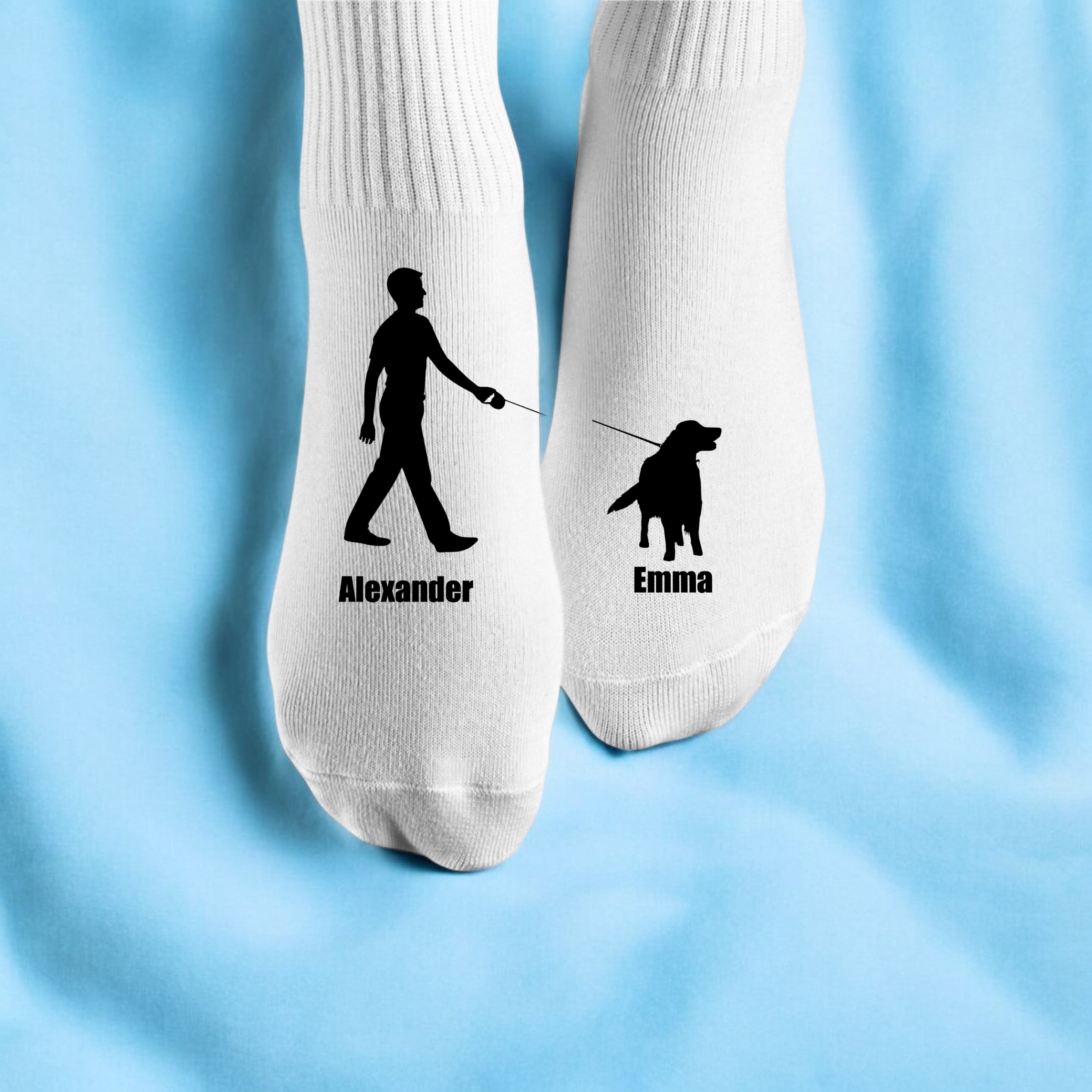 Jede Socke zeigt vorne ein anpassbares Design: Auf einer Socke ist das Abbild von dir als stolzer Hundebesitzer oder -besitzerin, während auf der anderen Socke dein geliebter Hund abgebildet ist. Unter den Abbildungen stehen individuell eure Namen, sodass diese Socken ganz besonders und persönlich sind.