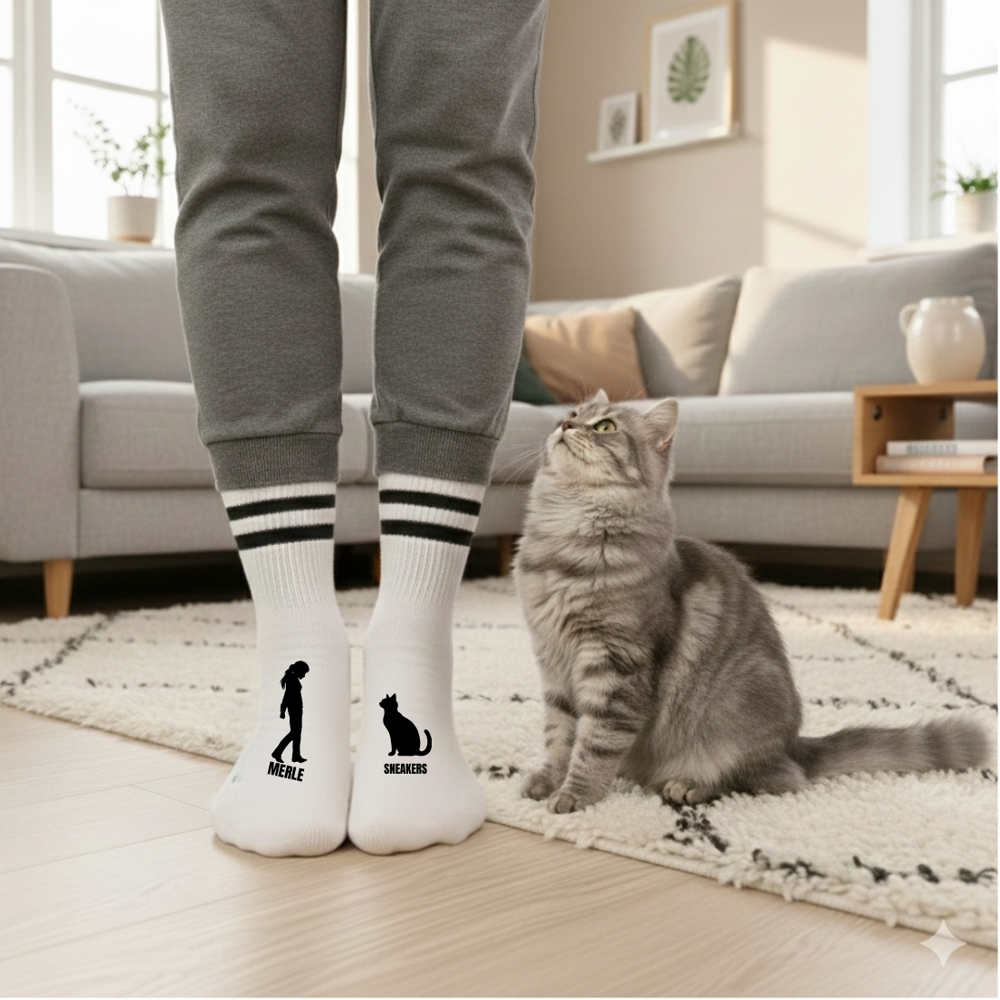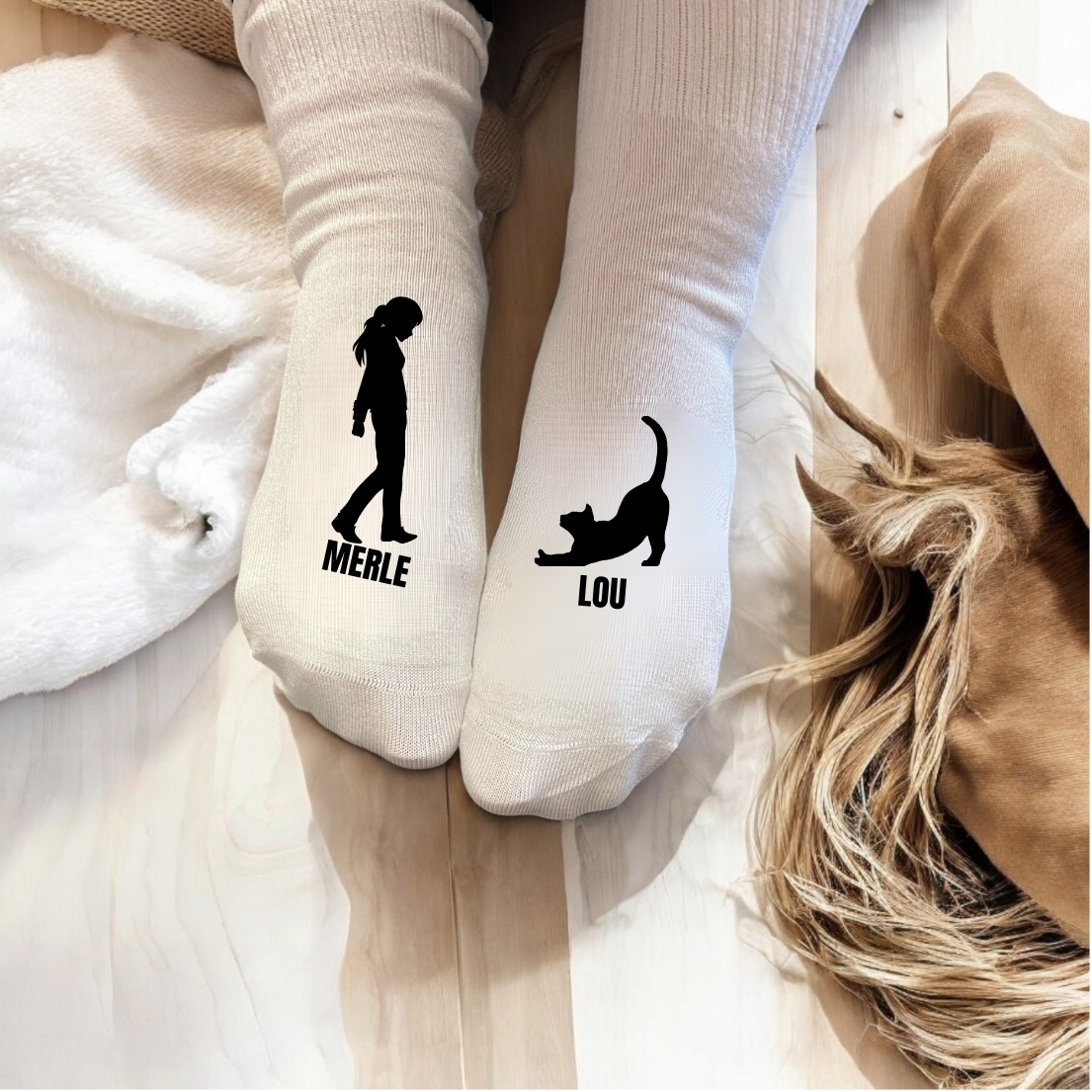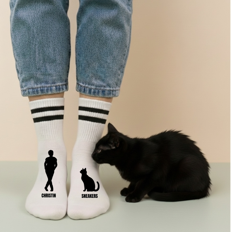 Diese individuellen Socken feiern auf charmante Weise die besondere Verbindung zwischen dir und deiner Katze – perfekt als Geschenk oder zum Selbstverwöhnen.